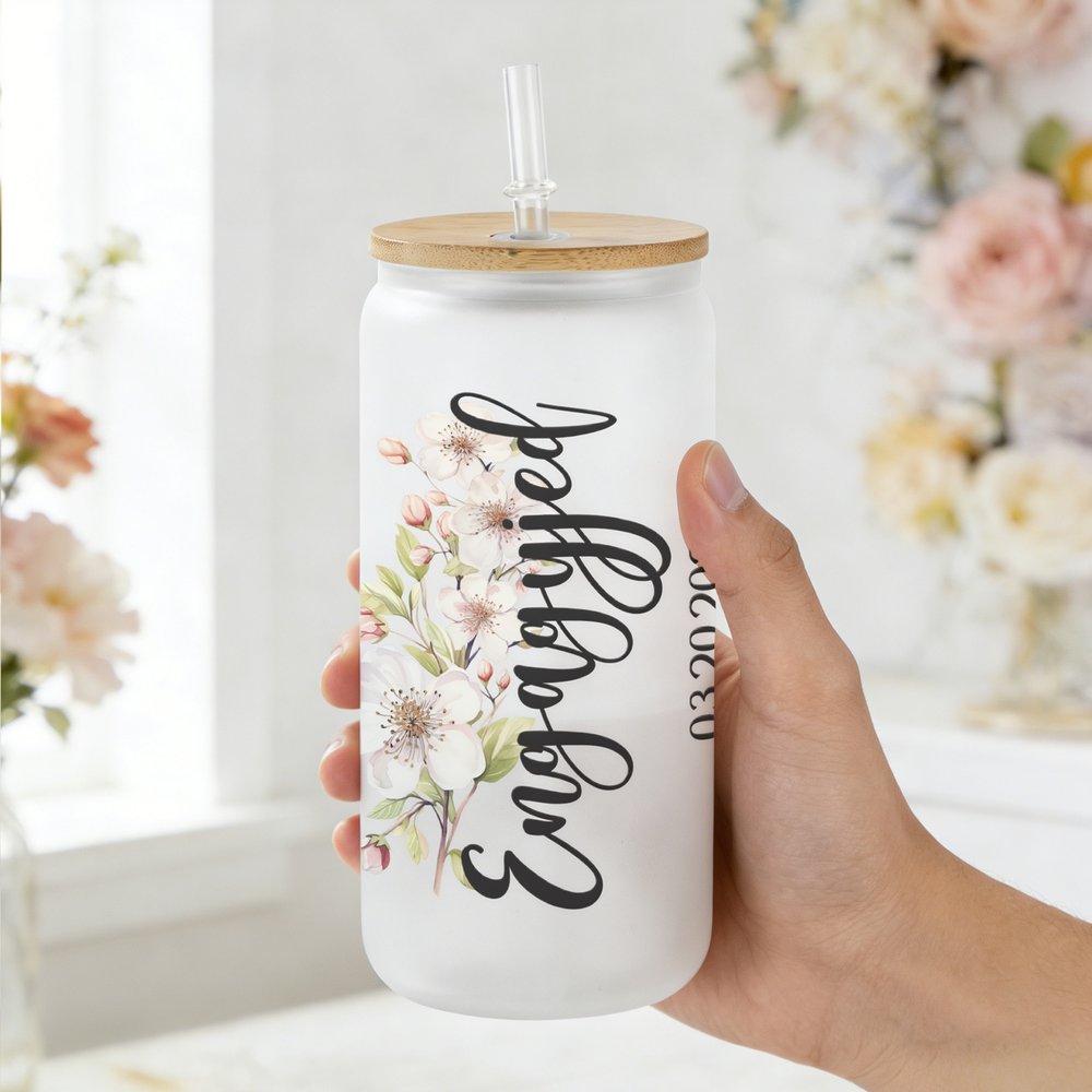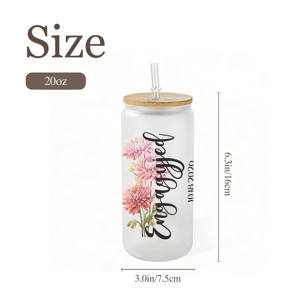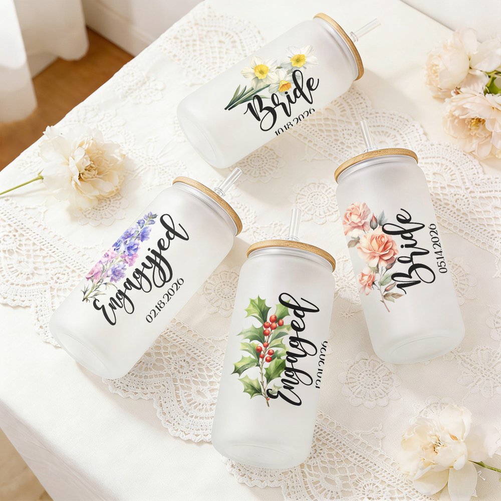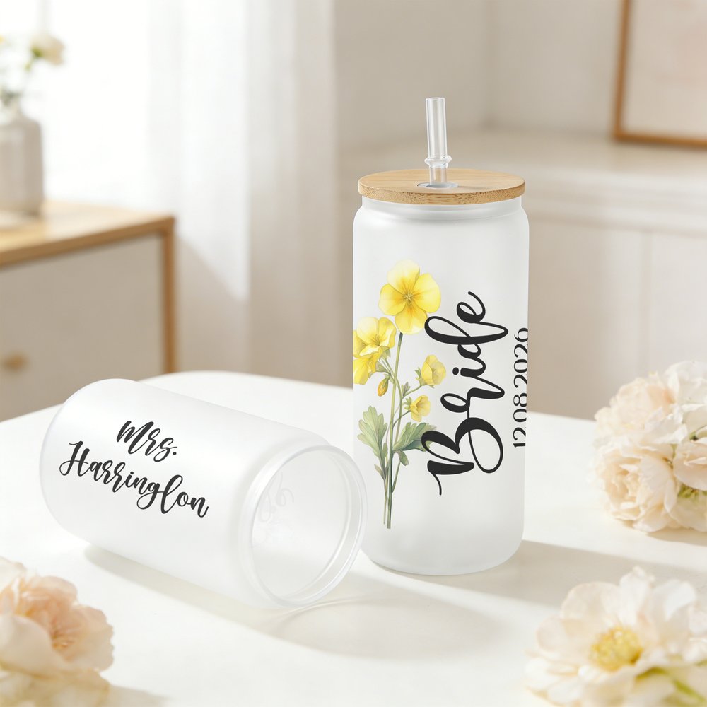 Esta copa presenta un precioso diseño romántico adornado con delicados motivos florales de nacimiento y puede personalizarse con texto, nombres y fechas de boda. El exquisito motivo floral corresponde al mes de nacimiento de la novia, y cada flor simboliza el amor y los nuevos comienzos. El diseño general combina con acierto la elegancia de las plantas con una tipografía limpia y moderna, creando una pieza clásica y atemporal a la vez que profundamente personal.