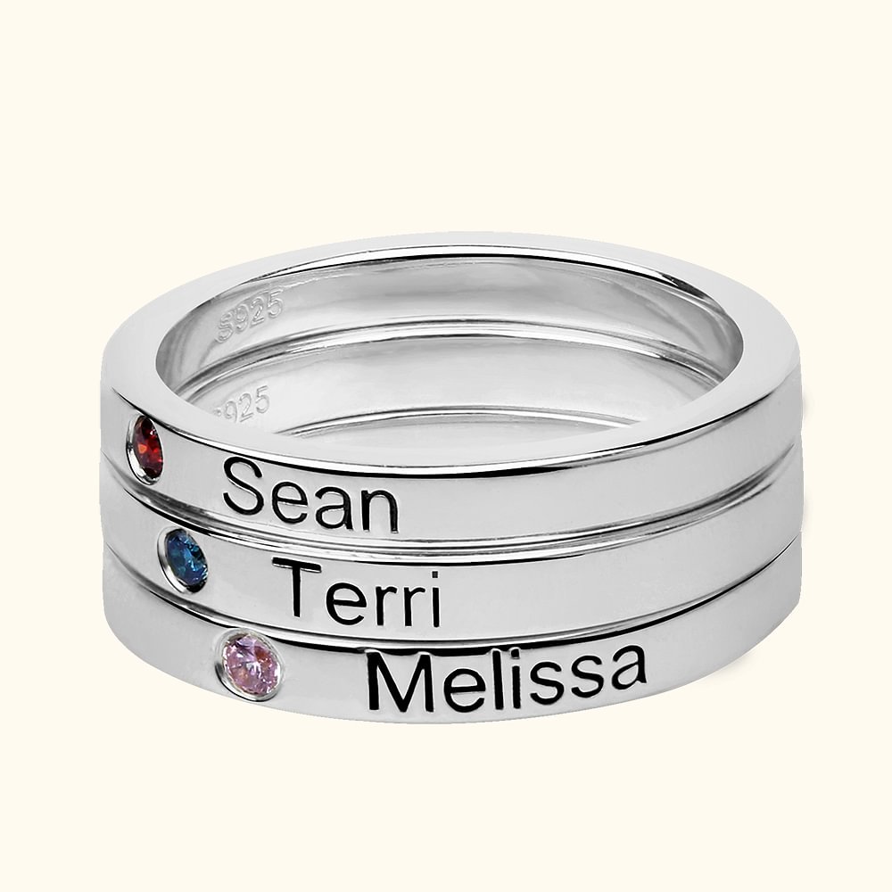 - Los anillos son de plata. En cada anillo se puede grabar un nombre y luego engarzar una bonita piedra de nacimiento en el centro.