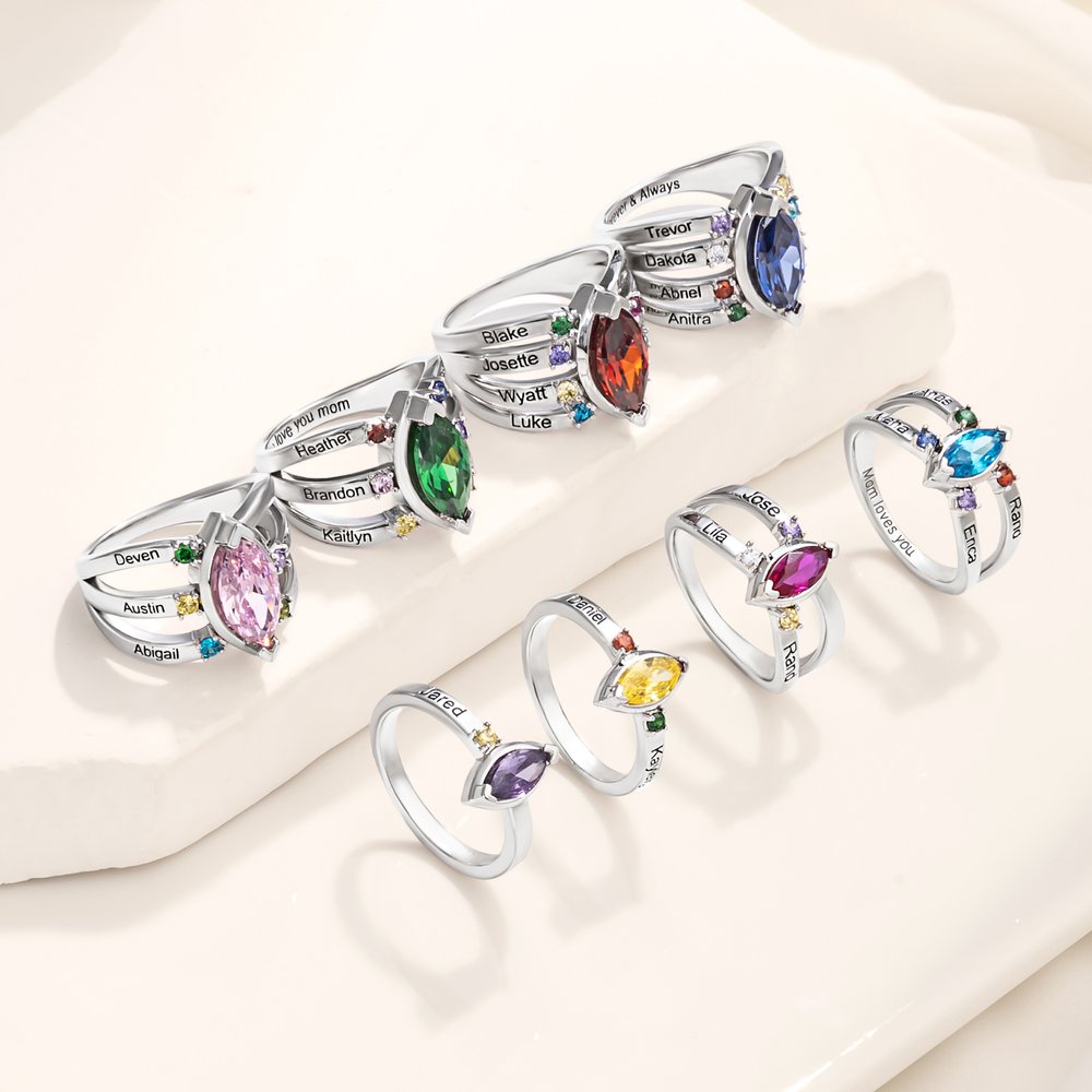 Este impresionante anillo de piedras de nacimiento puede personalizarse con 1-8 piedras de nacimiento y nombres grabados, que representan los vínculos que comparte con los miembros más queridos de su familia. Cada piedra rodea la piedra principal en forma de pera, simbolizando el profundo vínculo entre usted y sus seres queridos.