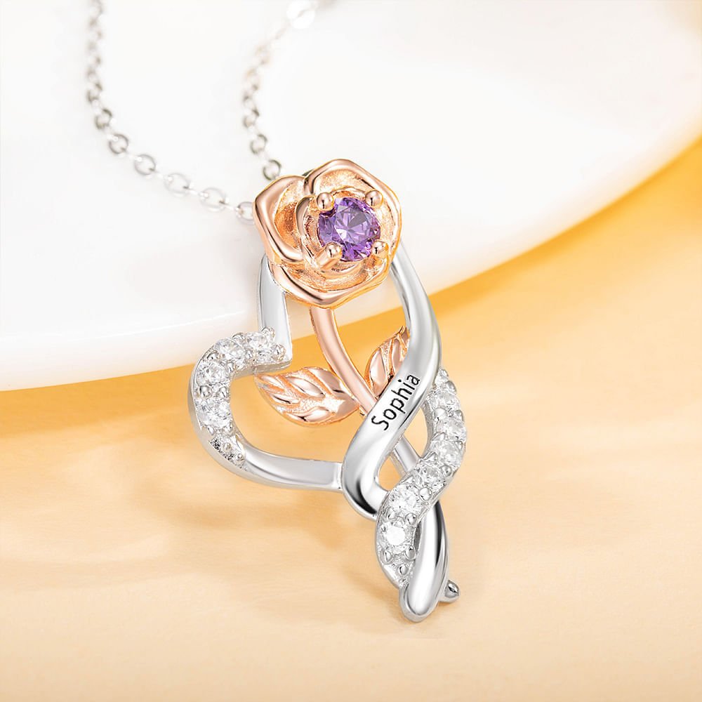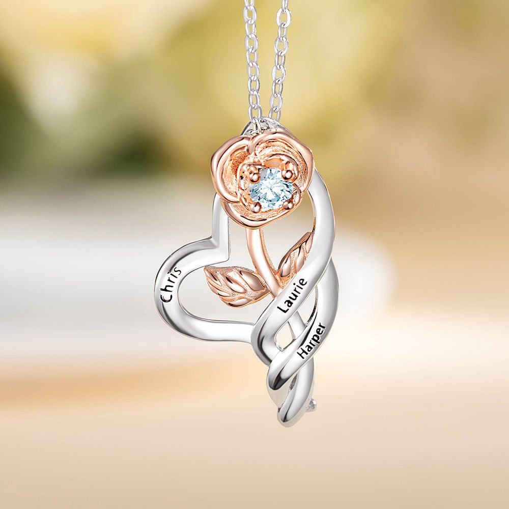 El collar personalizado de rosas con piedras de nacimiento es un regalo hermoso y significativo que celebra el vínculo entre los seres queridos. El delicado colgante de rosa está adornado con piedras de nacimiento y se puede personalizar con nombres, por lo que es un sentido homenaje a las relaciones queridas.