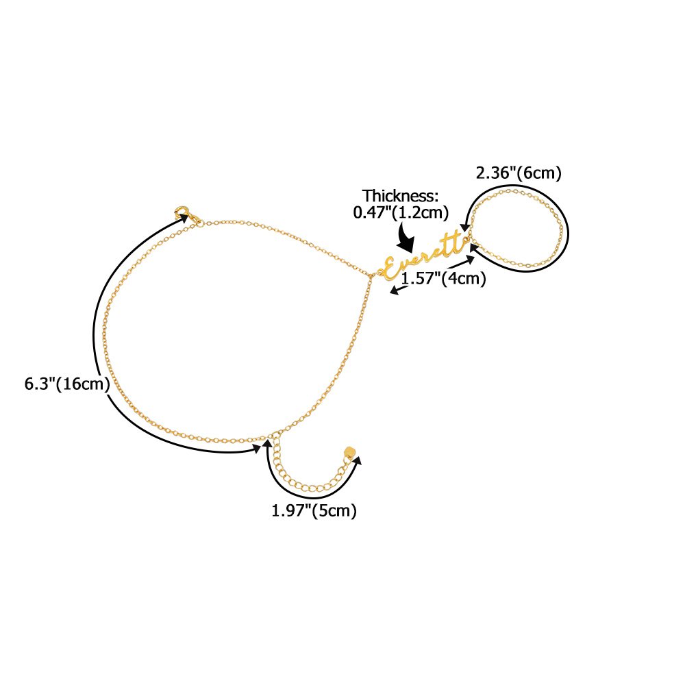 Esta cadena de mano presenta un diseño integrado que conecta con elegancia una pulsera con un anillo, personalizado con un nombre en una delicada fuente de letra de inspiración bohemia. Disponible en tres acabados clásicos, acentúa con gracia el contorno de la mano, realzando el encanto femenino a la vez que crea un distintivo de moda que es exclusivamente tuyo.