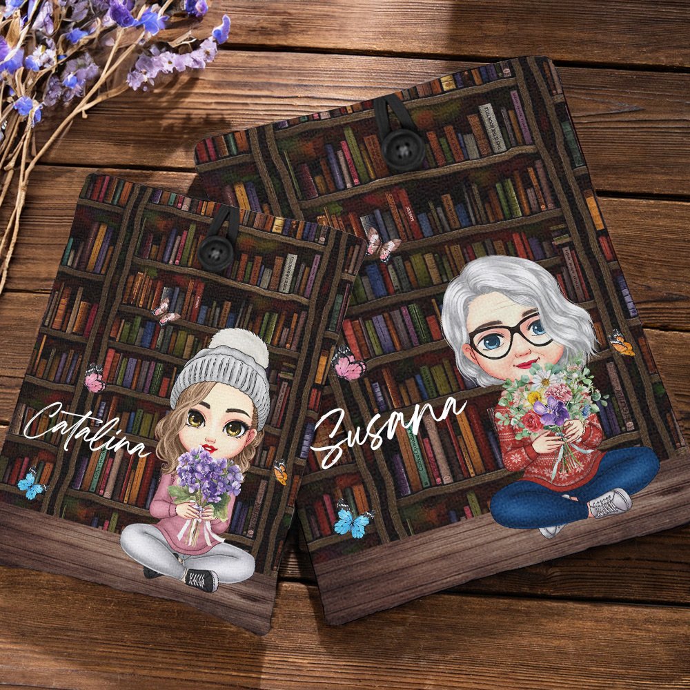 Esta funda de libro presenta un encantador diseño de dibujos animados que puedes personalizar con tu nombre y un bonito ramo de flores. Combinada con el fondo de una estantería llena de libros, tiene un aspecto elegante y único, muy llamativo.