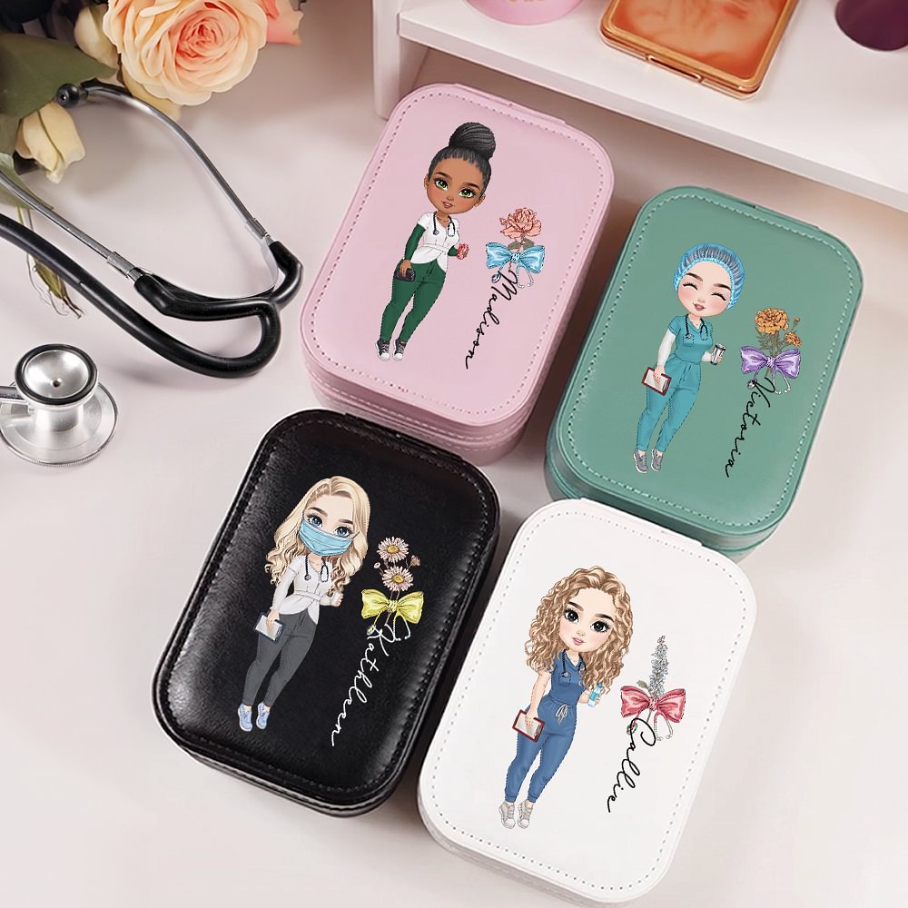 Este joyero combina a la perfección elementos médicos con elegantes toques personales. Con un personaje médico de dibujos animados, un estetoscopio, una flor de nacimiento y un bonito lazo con un nombre personalizado, es un accesorio llamativo para cualquier profesional sanitario.