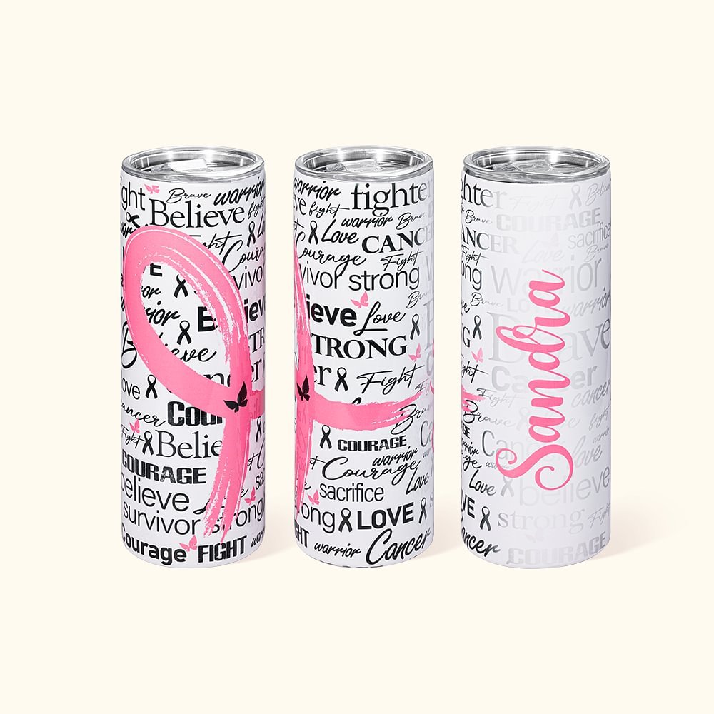 Este vaso fino de 20 oz con nombre personalizado no es sólo un recipiente para tus bebidas, es un emblema de fuerza, coraje y solidaridad en la lucha contra el cáncer de mama. El diseño estilizado y delgado, junto con la ilustración del lazo rosa, crea un vaso visualmente llamativo que sin duda será un regalo muy a tener en cuenta para cualquier guerrero contra el cáncer de mama.