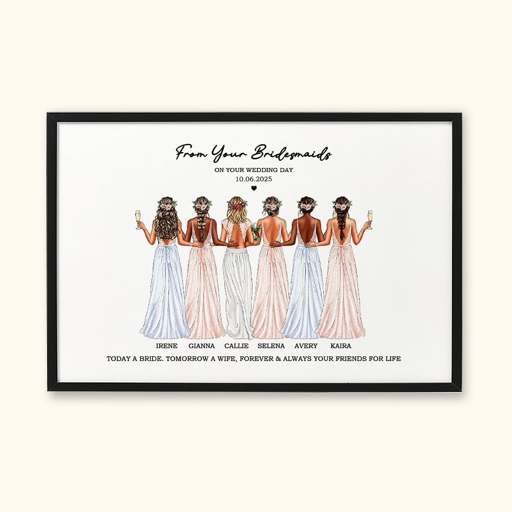 En cuanto lo vea, se sentirá inmediatamente atraído por su encanto y elegancia únicos. El cuadro muestra a la hermosa novia rodeada de sus encantadoras damas de honor, todas brindando en señal de celebración. La adición de los nombres de la novia y de las damas de honor, la fecha de la boda y la sentida cita de la bendición crean una pieza verdaderamente personalizada y memorable.