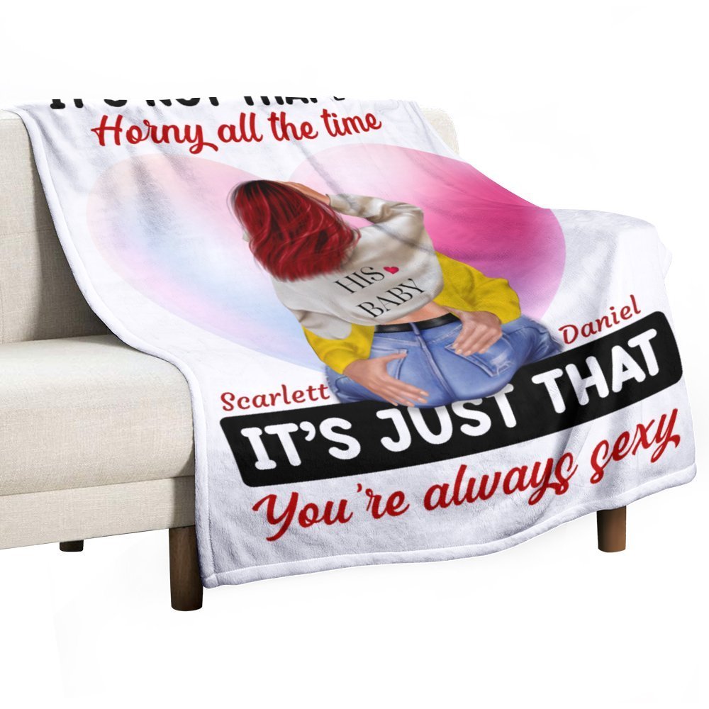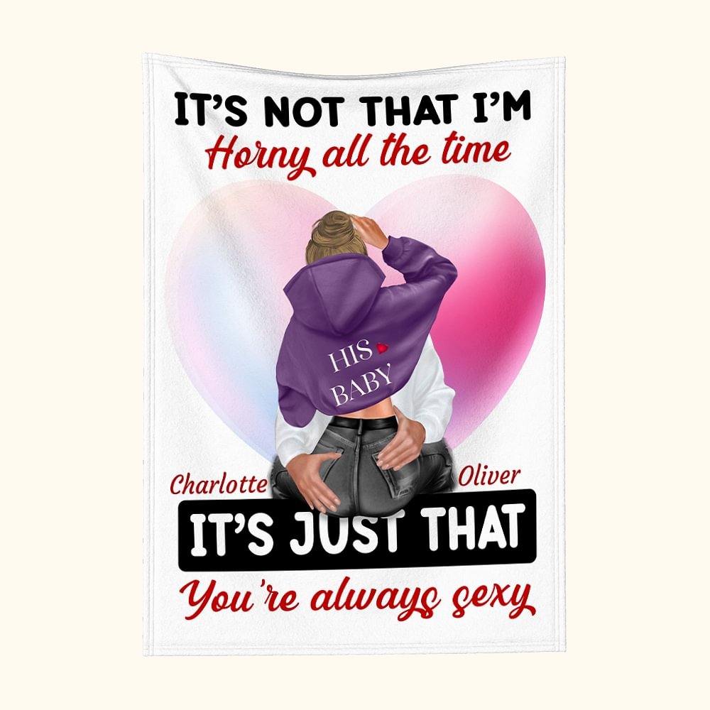 Nuestra manta presenta una pareja abrazada como elemento de diseño, con una burbuja de corazón enamorado como fondo y el texto "No es que esté cachondo todo el tiempo, es que tú siempre eres sexy" para darle al diseño general un matiz más emocional. La manta en sí simboliza el calor, mientras que el diseño del amante le da un significado más apasionado y romántico, haciendo de esta manta una verdadera necesidad para las parejas.