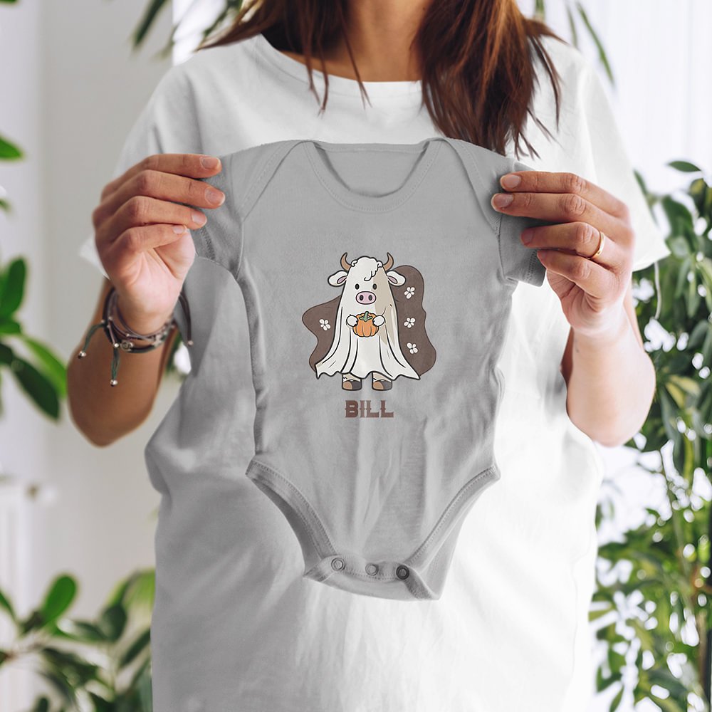 Lindo diseño de body de bebé con una linda vaca fantasma con calabaza impresa, y el nombre del bebé se puede personalizar, es un regalo muy práctico y elegante para los bebés recién nacidos, niños o sobrinas, los bebés pueden usarlos participar en una celebración de Halloween.
