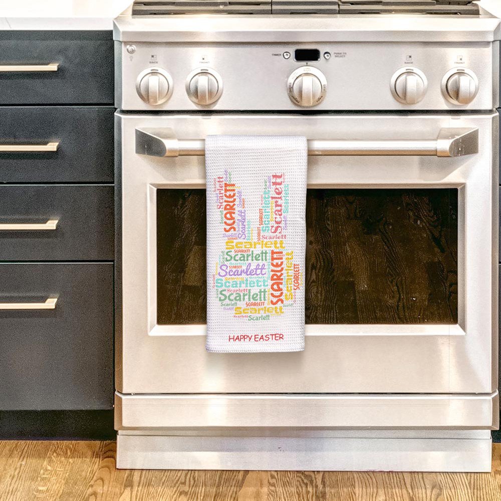 Este paño de cocina Feliz Pascua presenta una nube de palabras única en forma de conejo con su nombre personalizado, capturando de forma única y artística el elemento de Pascua. El nombre personalizado ingeniosamente colocado dentro del contorno del conejito crea un diseño visualmente atractivo y apropiado para la Pascua. Combina a la perfección funcionalidad y decoración, aportando calidez a cualquier cocina o comedor.