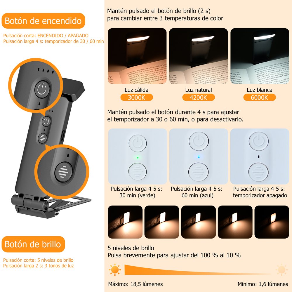 El diseño con clip se sujeta fácilmente a libros, partituras o tableros de dibujo, y sirve tanto como luz de lectura como marcapáginas. La función de temporizador de apagado automático se activa durante la lectura en la cama, apagando automáticamente la luz cuando los niños se duermen, protegiendo el descanso y conservando la energía de la batería. Las sesiones de lectura en casa, los descansos durante los viajes, las noches de acampada o las situaciones de iluminación de emergencia se benefician de su suave iluminación.