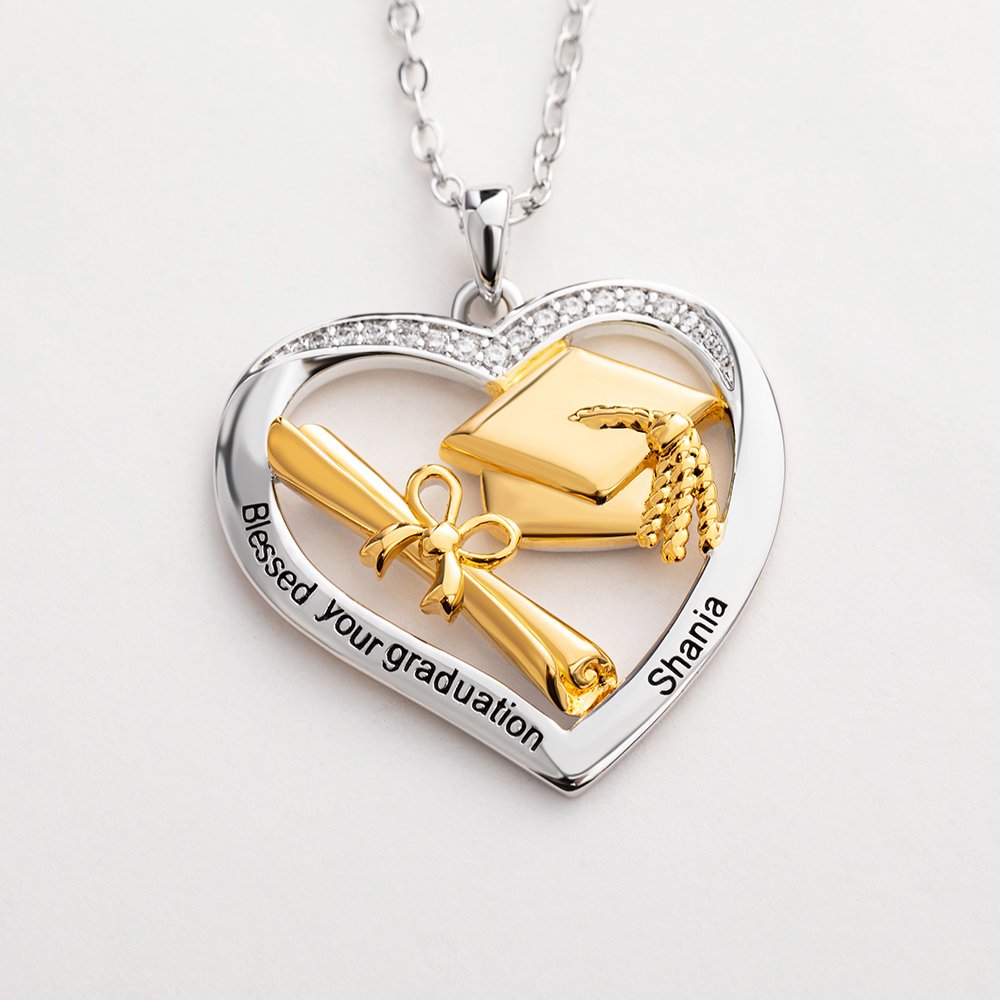 Este collar personalizado con un birrete de graduación, un pergamino y un corazón con circonitas es el recuerdo ideal para los graduados. Cada collar puede personalizarse con un texto inspirador, añadiendo un toque personal que lo convierte en un preciado recuerdo.
