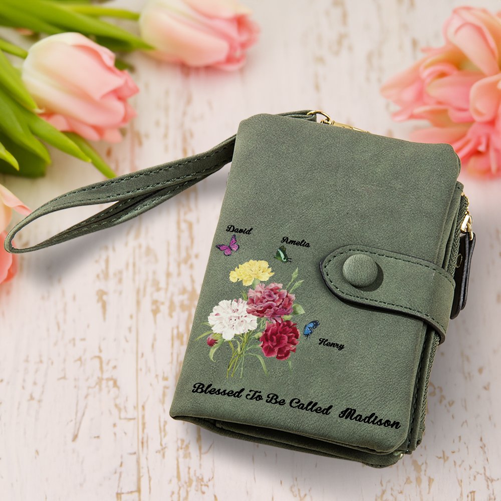 Esta cartera imprime un hermoso ramo de claveles, alrededor con 1-6 mariposas de nacimiento, cada mariposa representa el mes de nacimiento de un niño, creando una cartera única y significativa que expresa amor y admiración por las madres o abuelas.