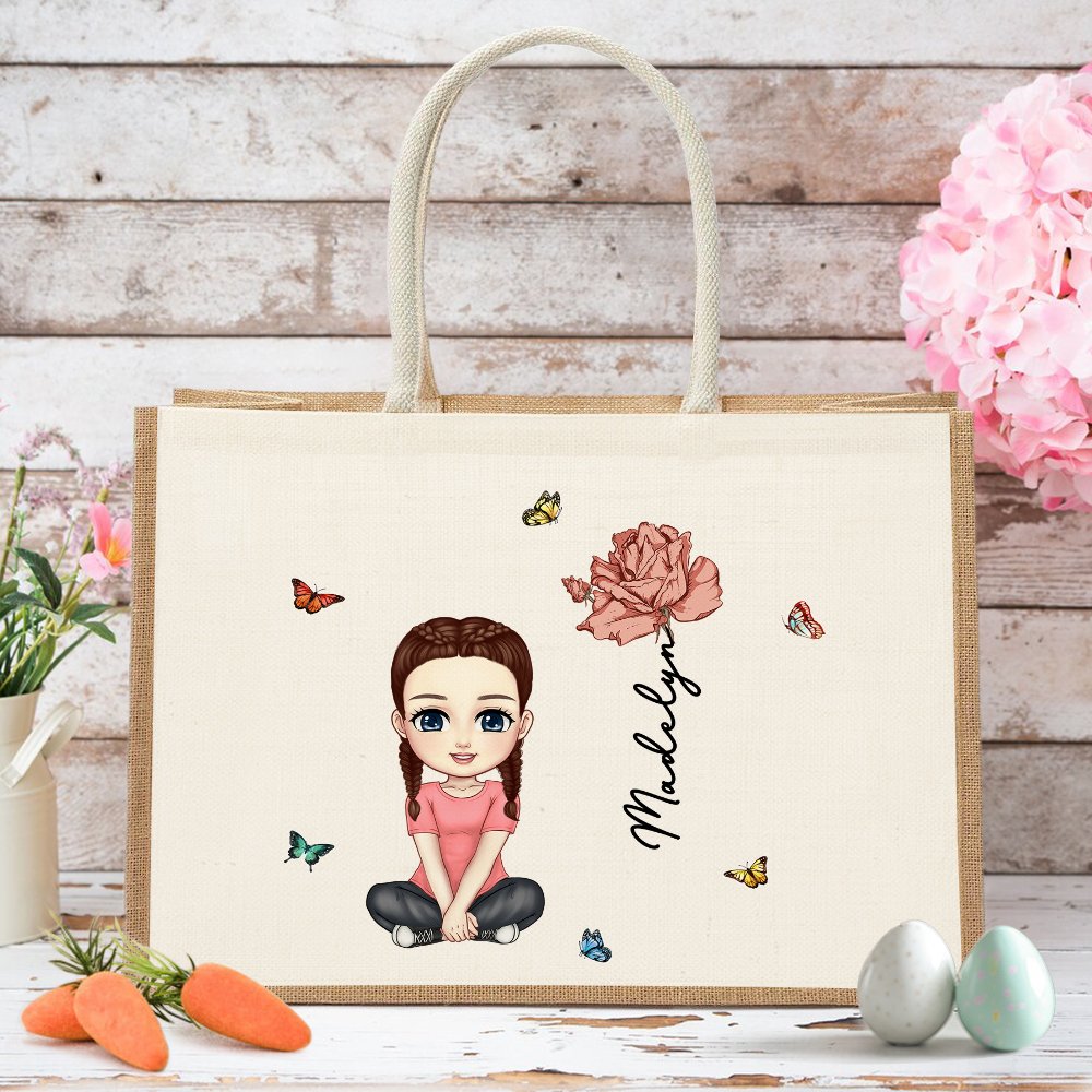 Este bolso se puede personalizar con un personaje de dibujos animados rodeado de mariposas y la flor de nacimiento correspondiente al mes de cumpleaños y combinada con el nombre, creando un regalo personalizado y lleno de sentimiento.