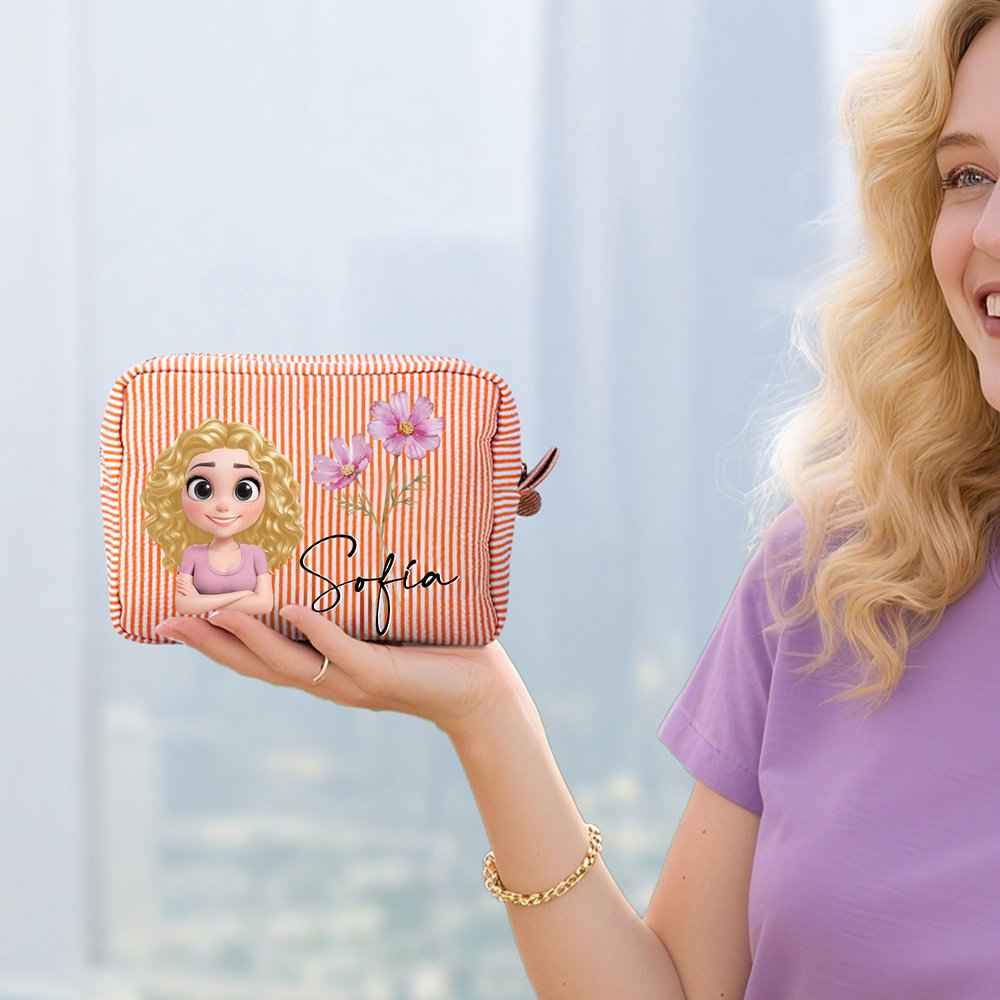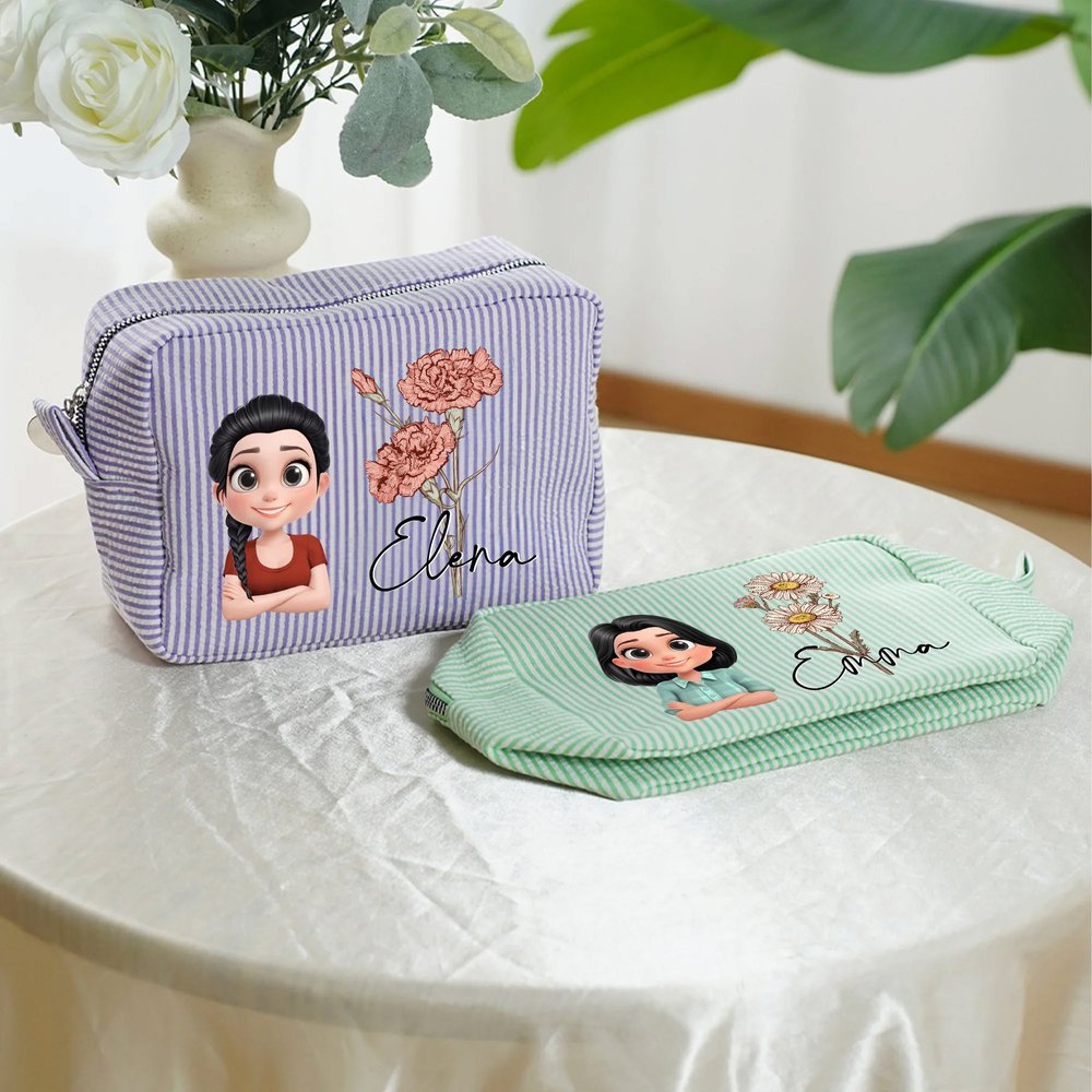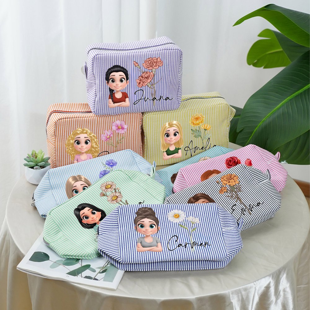 Cada neceser de rayas presenta encantadores personajes 3D de dibujos animados y hermosas flores de nacimiento como temas centrales. Elaborado de forma especial para reflejar la individualidad y el estilo, además ofrece opciones de personalización: puedes añadir un nombre y convertir cada pieza en un recuerdo único y apreciado.