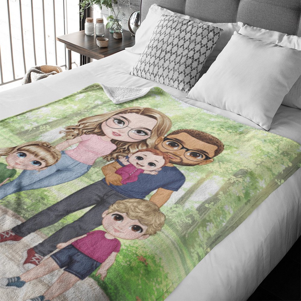 Esta manta está diseñada para abrigar a los miembros de la familia. Hay múltiples patrones de caracteres para que usted elija. Puede elegir su propia manta única según sus preferencias. El estampado de fondo verde añade un toque de calidez.