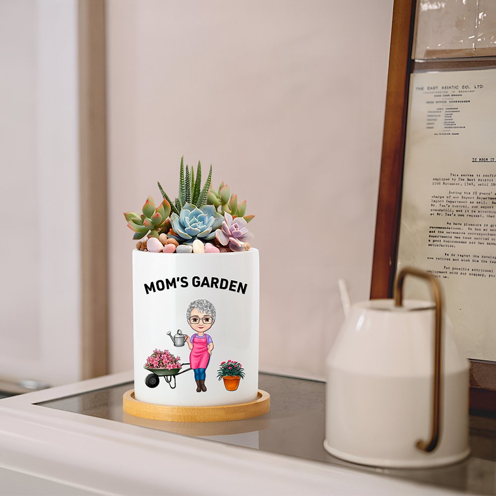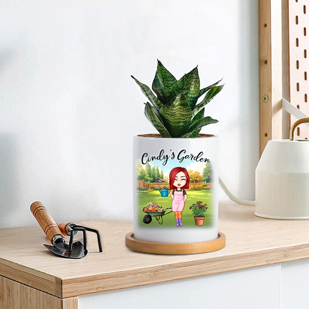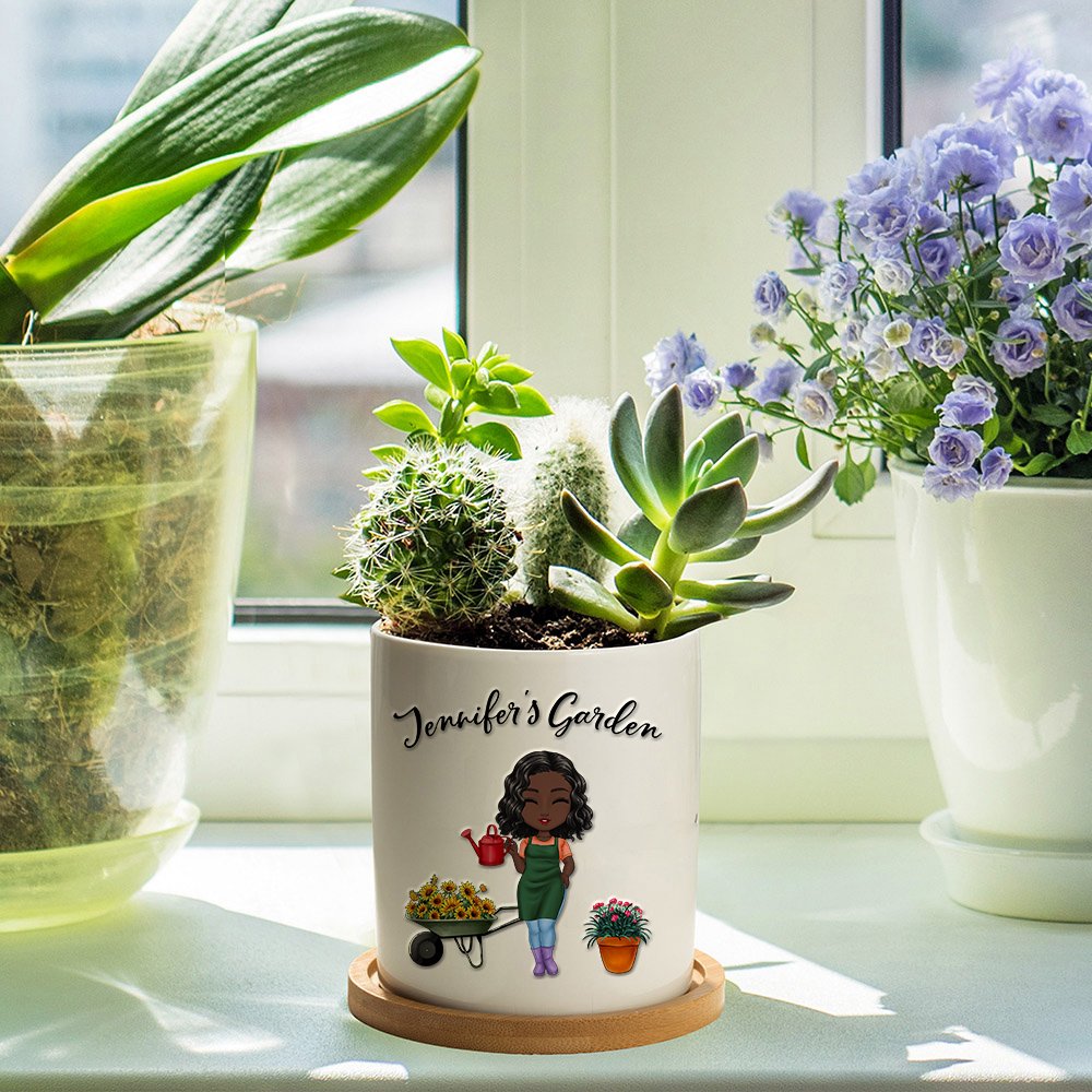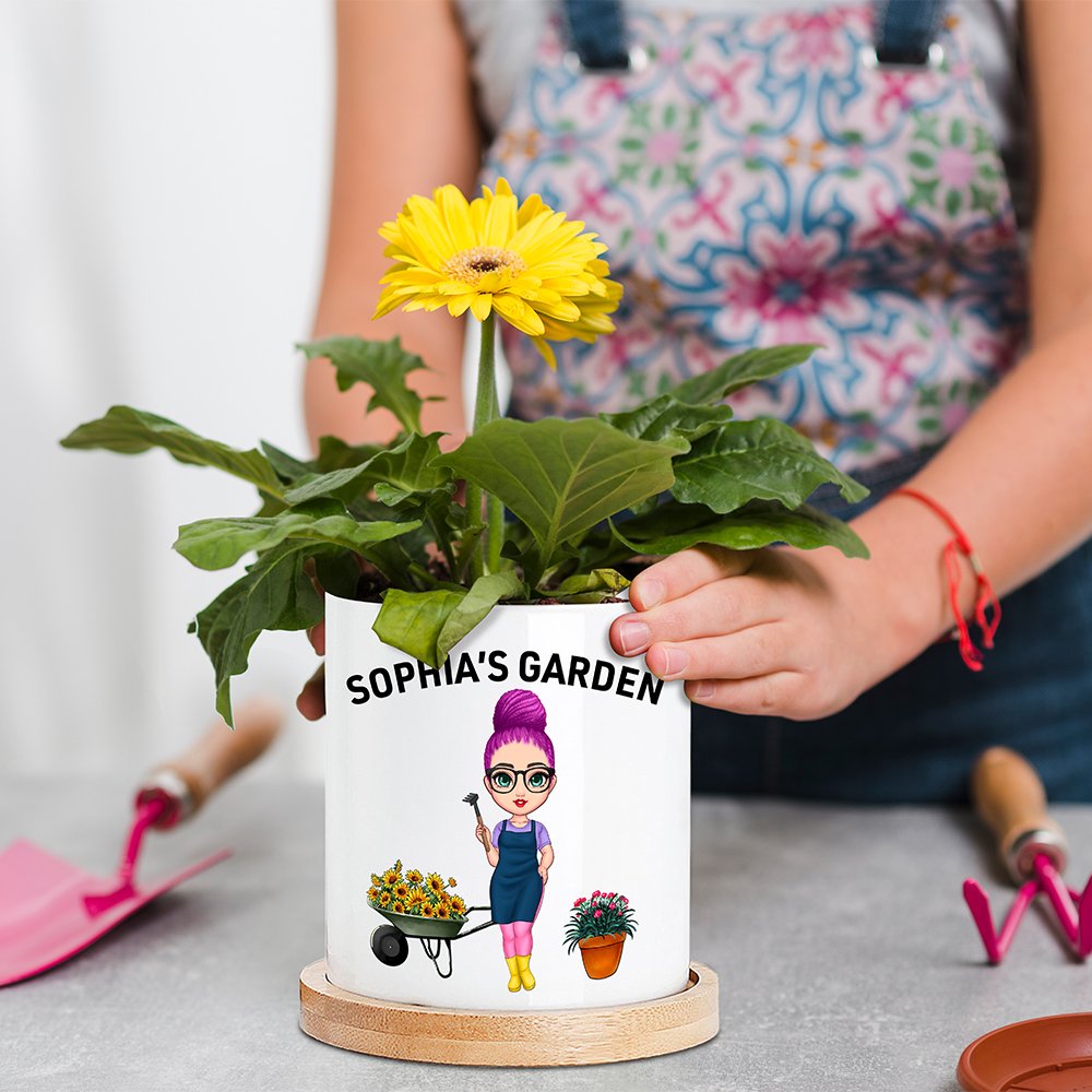 Esta maceta está especialmente diseñada para los aficionados a la jardinería. Presenta un simpático personaje de dibujos animados en la parte delantera, que puedes personalizar con tu peinado, tono de piel, ropa, etc. preferidos. El personaje está rodeado de elementos relacionados con la jardinería, como una regadera en la mano y unas macetas y un carro de flores cercanos, que le dan un toque vivo y dinámico. Además, puedes añadir tu nombre a la maceta, creando un objeto único para ti.