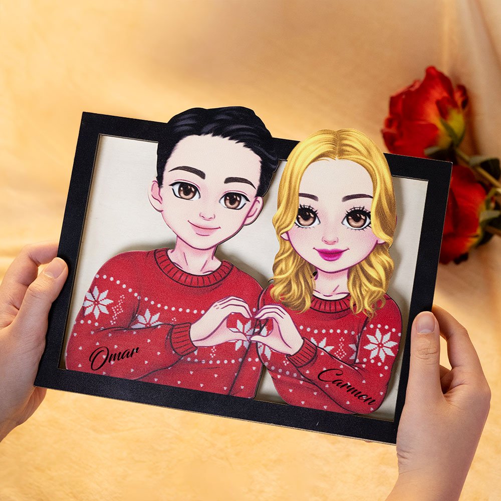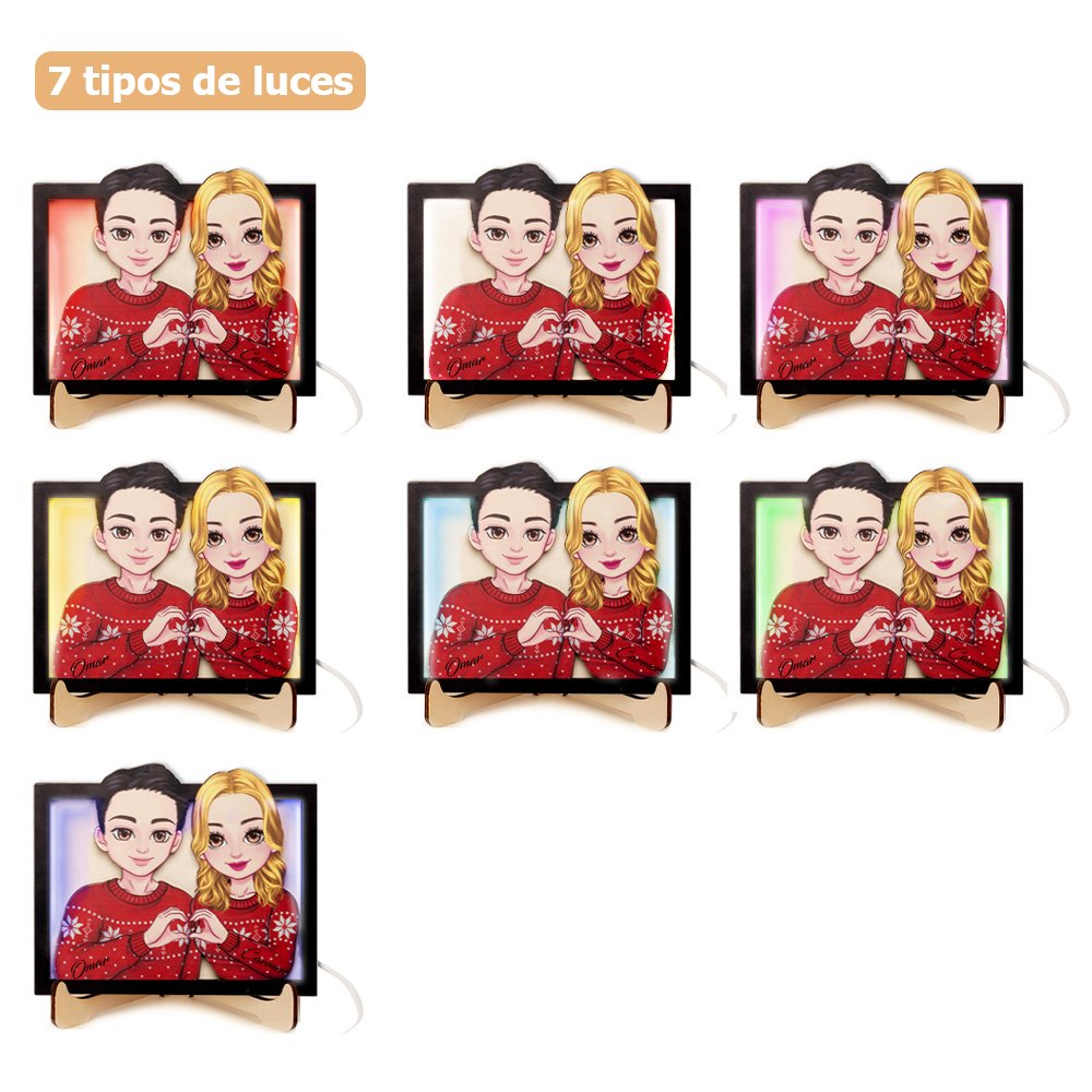 El marco presenta un diseño encantador con personajes de dibujos animados que hacen un gesto de corazón. Cada personaje se puede personalizar con su nombre, añadiendo un toque único y personal.