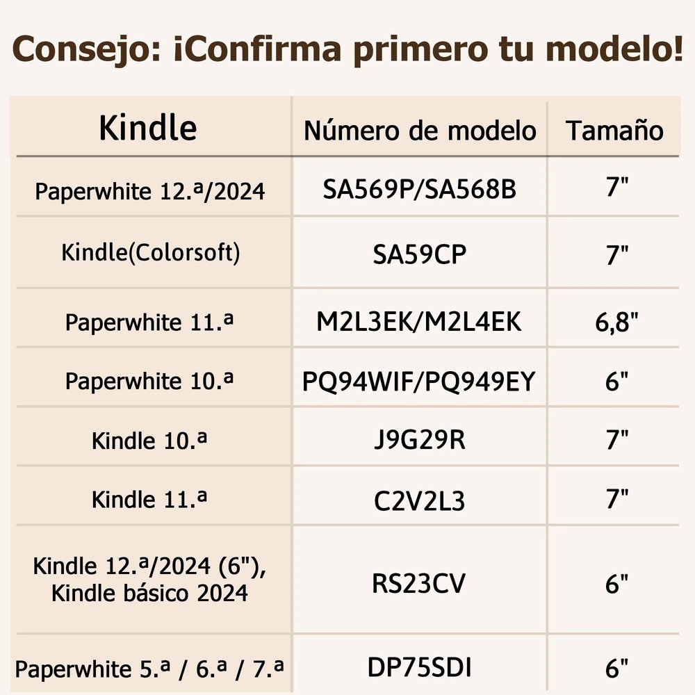 | Medidas: | Paperwhite 12.ª generación 2024 (7"), Kindle Colorsoft, Paperwhite 11.ª generación (6,8"), Paperwhite 10.ª generación (6"), Kindle 10.ª generación (6"), Kindle 11.ª generación (6"), Kindle 12.ª generación 2024 (6"), Kindle Básico 2024, Paperwhite 5.ª/6.ª/7.ª generación (6") |