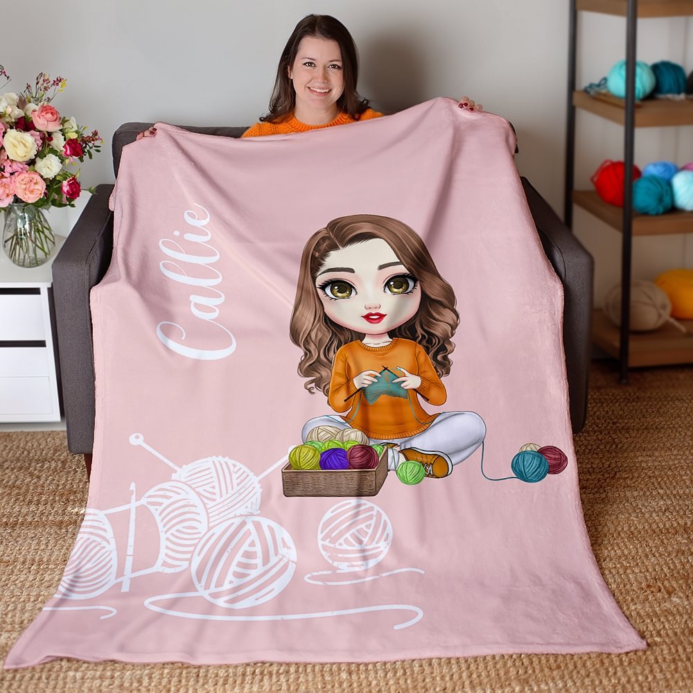 El diseño de esta manta presenta cálidos elementos de punto de ganchillo. La manta lleva impreso un personaje de dibujos animados que hace punto, y el nombre personalizable la hace más exclusiva. Los 45 colores de la manta le ofrecen más opciones.