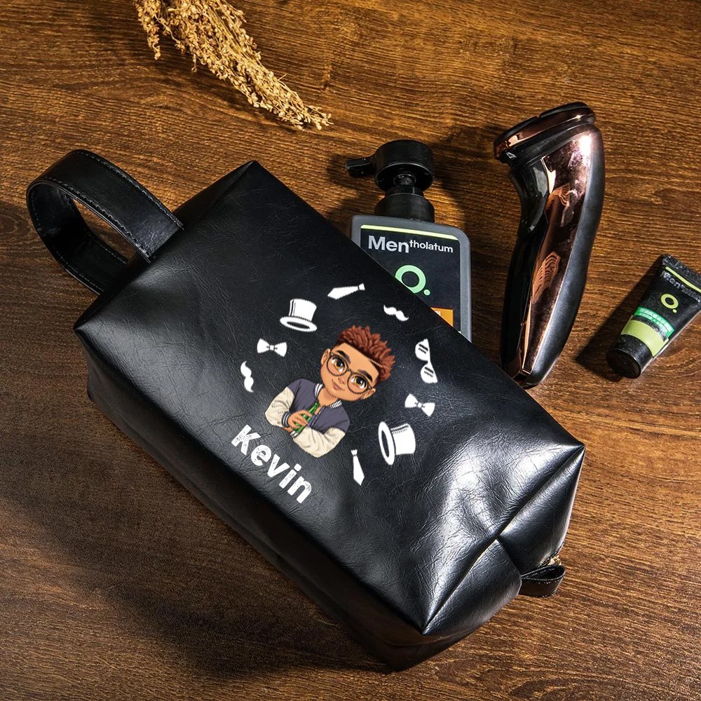 Nuestro neceser destaca con un elegante caballero de dibujos animados basado en su imagen, rodeado de sombreros de copa, corbatas y gafas de sol. Le ofrecemos 5 colores de neceser diferentes para que elija, cada uno de los cuales ofrece una sensación de calma y belleza clásica. Además, puede personalizar su nombre en la superficie de esta bolsa, haciéndola fácilmente identificable.