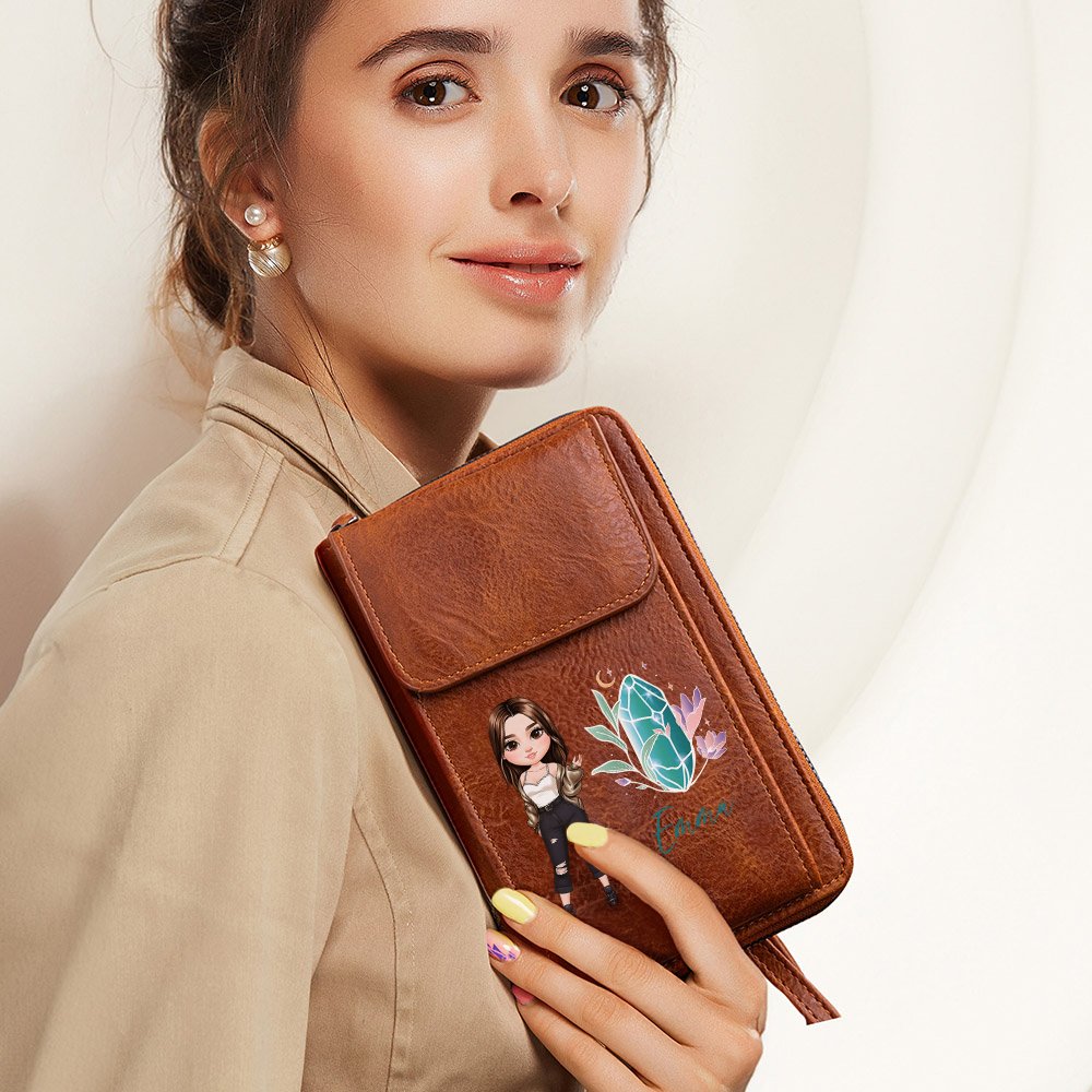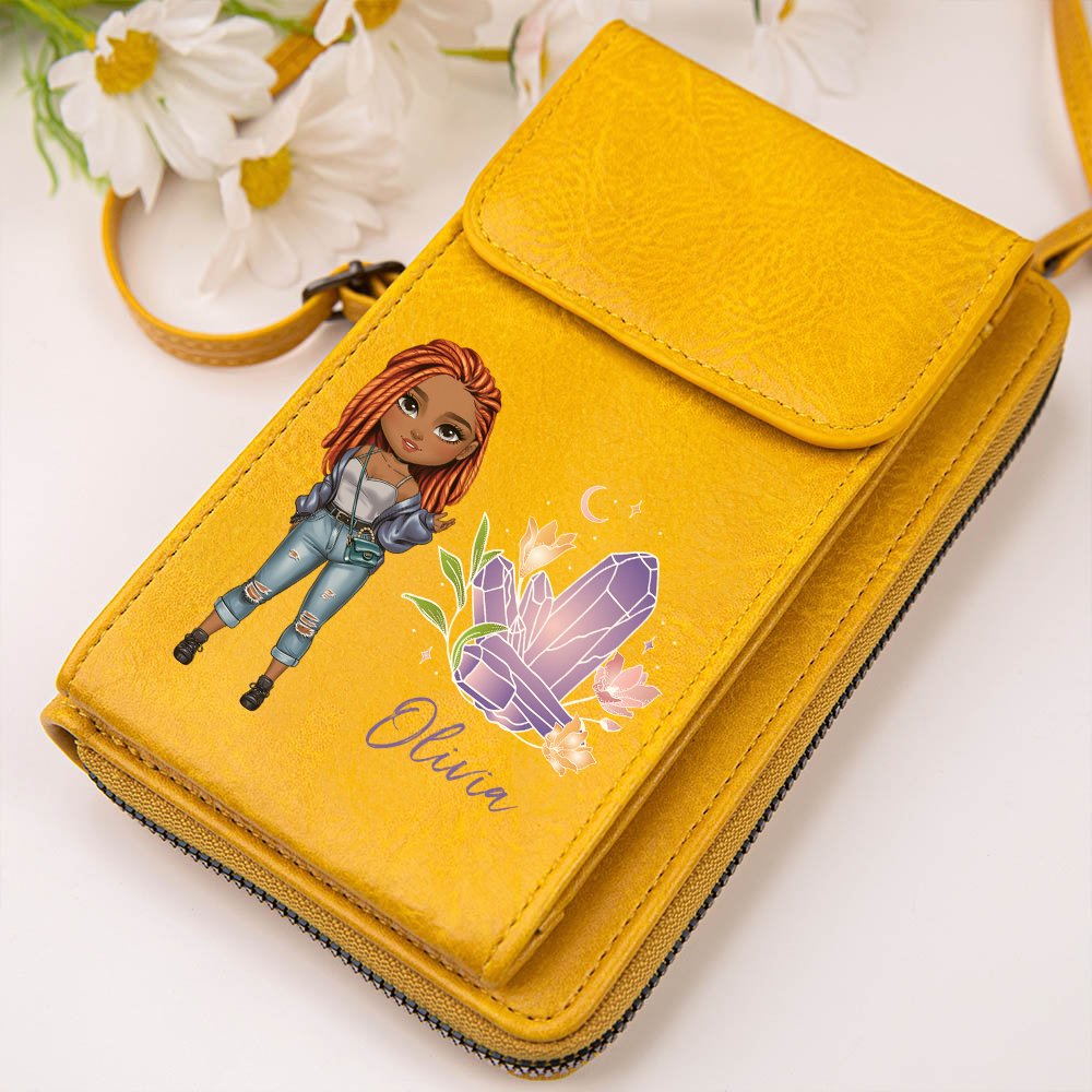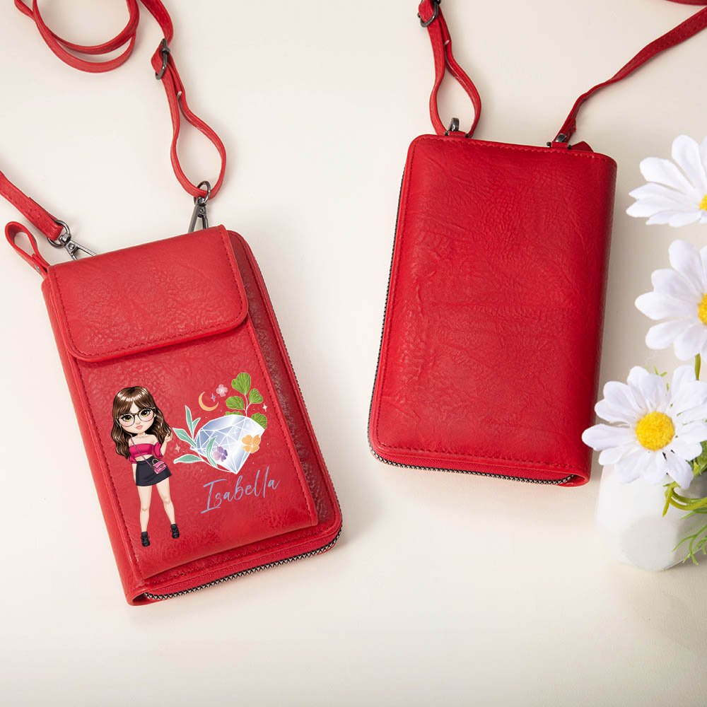 Esta cartera cruzada presenta un elegante clipart de niña que puede personalizarse con la piedra de nacimiento de tu mes de nacimiento, o sólo con la piedra de nacimiento y el nombre. La piedra de nacimiento está adornada con la luna, estrellas y flores de colores, lo que hace que el diseño sea aún más misterioso y romántico.