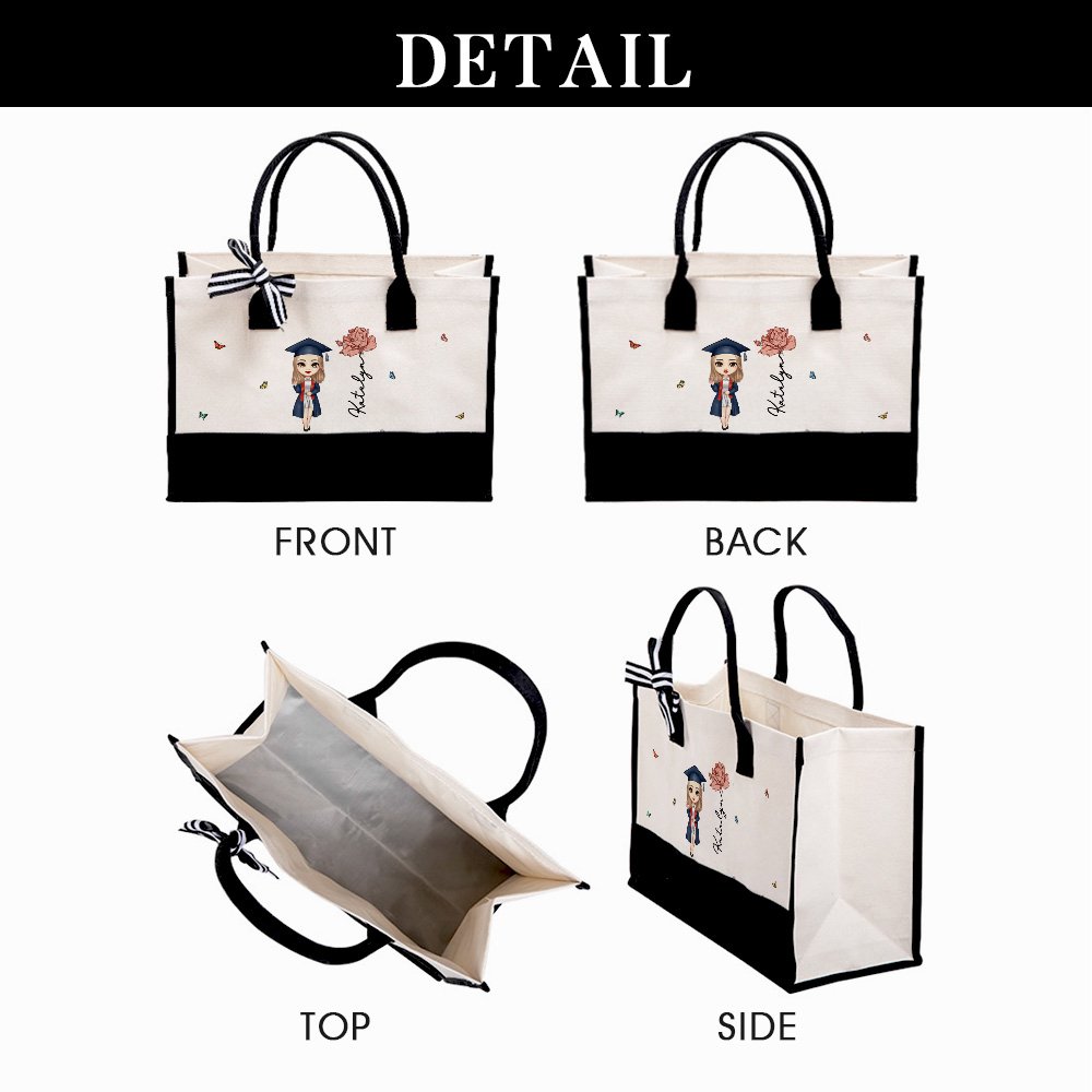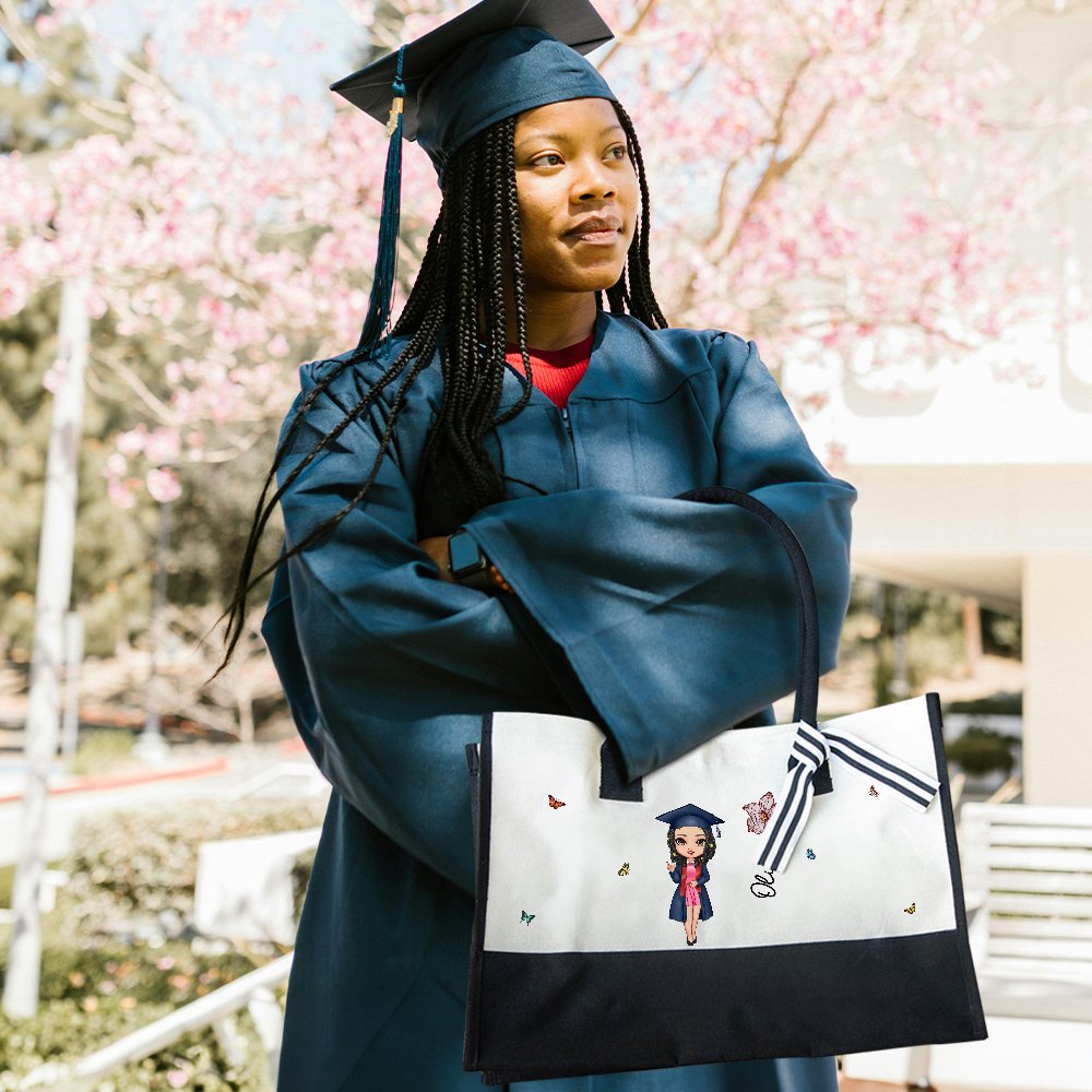 Esta bolsa de mano combina a la perfección una asombrosa flor de nacimiento y un simpático personaje de dibujos animados para graduados. También se puede personalizar con el nombre del graduado para crear una bolsa única y significativa que no sólo registra el importante momento de la graduación, sino que también añade diversión y calidez al aspecto general.