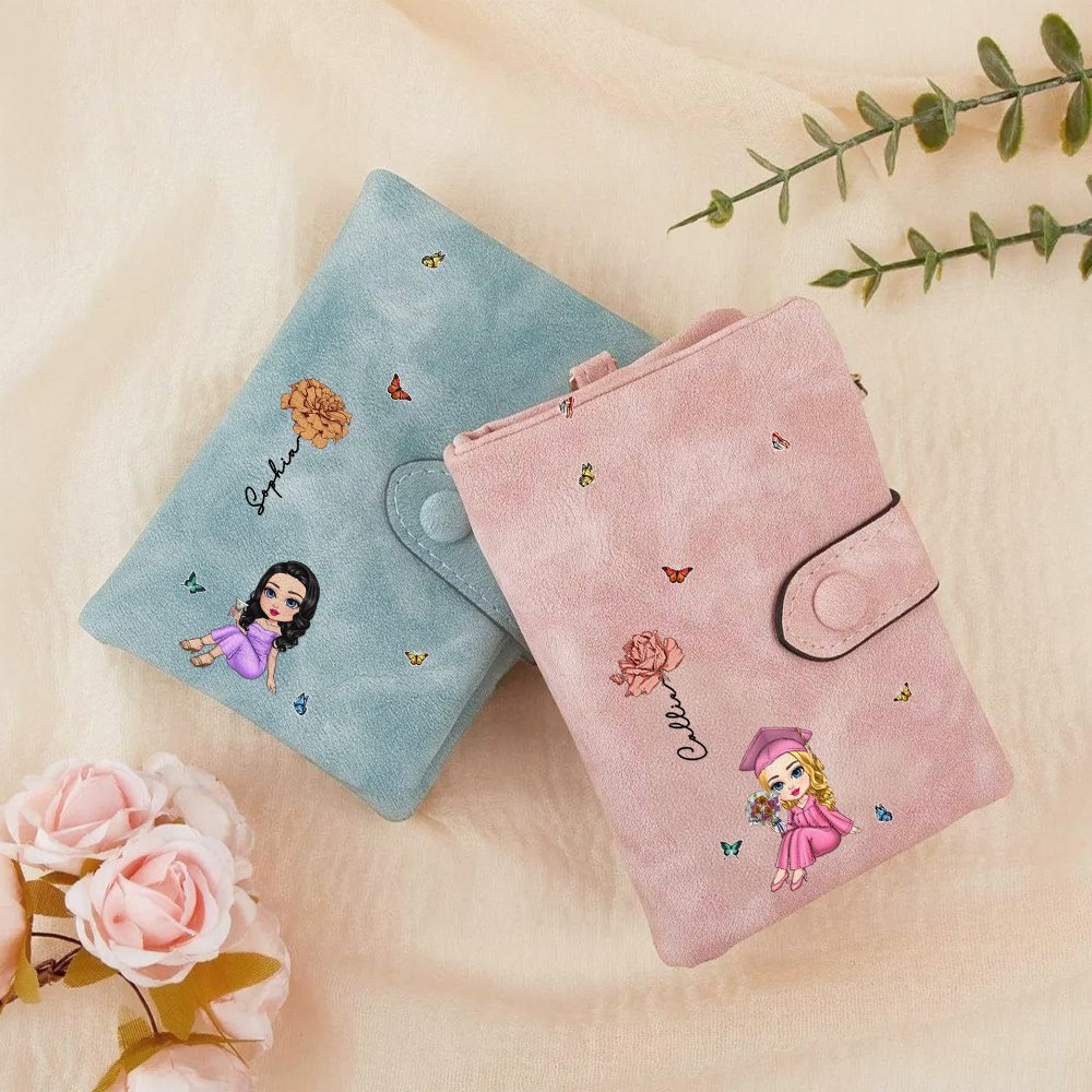 Esta cartera combina a la perfección impresionantes flores de cumpleaños y simpáticos personajes de dibujos animados de graduados, y también se puede personalizar con el nombre del graduado para crear una cartera única y significativa para expresarle su enhorabuena.