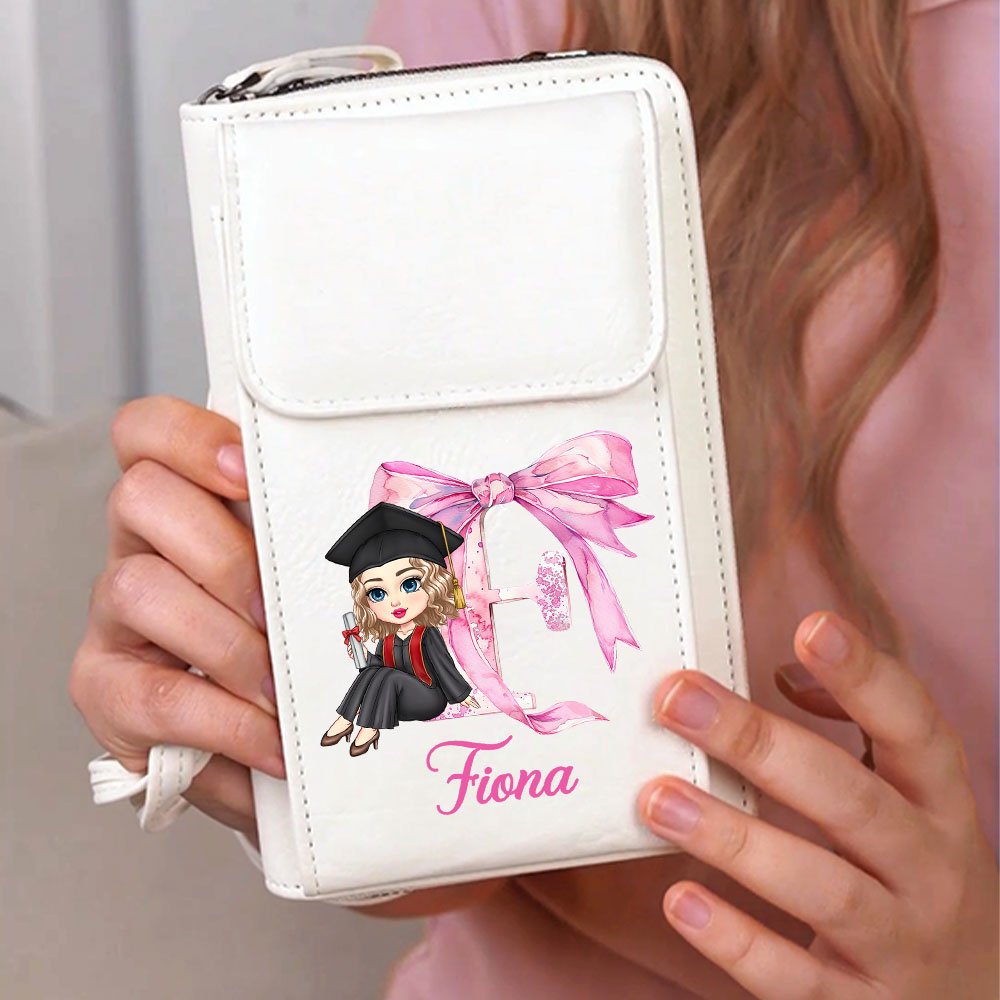 Esta bolsa bandolera lleva impresa la imagen de dibujos animados de una graduada y el correspondiente diseño de la inicial del lazo. Puede personalizarla según sus preferencias personales, para mostrar el estilo único y los logros de los graduados. Además, puede personalizar su nombre en la bolsa bandolera para hacerla aún más distintiva.