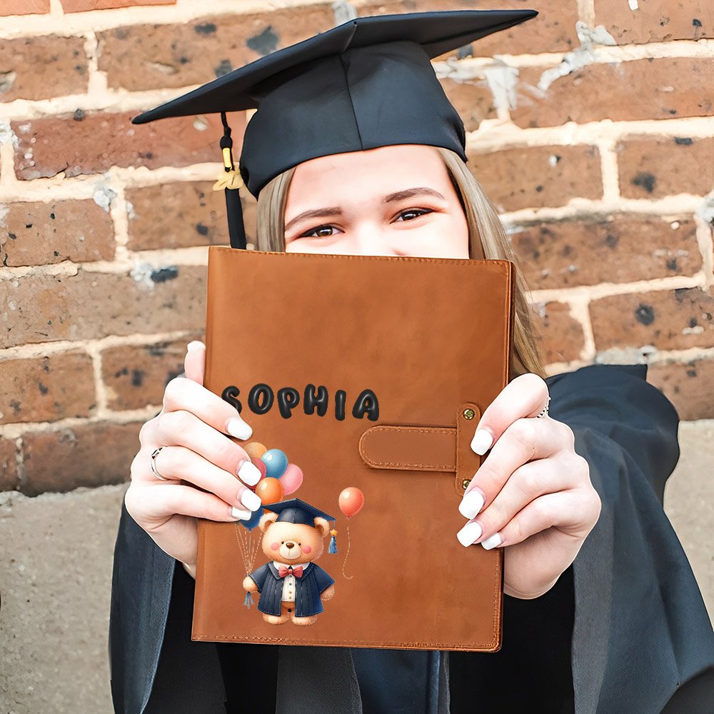Esta cubierta de cuaderno presenta un oso de graduación de dibujos animados, con una variedad de posturas encantadoras. Le ofrecemos hasta 16 motivos de osos diferentes, para que pueda elegir el que mejor se adapte a su estilo. La cubierta marrón le aporta una sensación de calma y clasicismo, mientras que la personalización de su nombre en la cubierta, hace que se sienta más único.