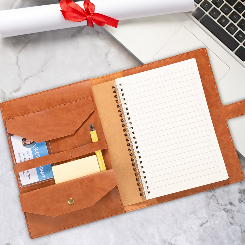 La tapa del cuaderno cuenta con varios compartimentos para guardar artículos de papelería, por lo que resulta ideal para el uso diario en la escuela o el trabajo. La tapa interior incluye un práctico bolsillo de almacenamiento, que permite a los usuarios guardar de forma ordenada pequeñas notas adhesivas, tarjetas, bolígrafos, gomas de borrar u otros artículos esenciales. También puede combinarse con un cuaderno A5 en blanco o rayado para crear un nuevo espacio de escritura.