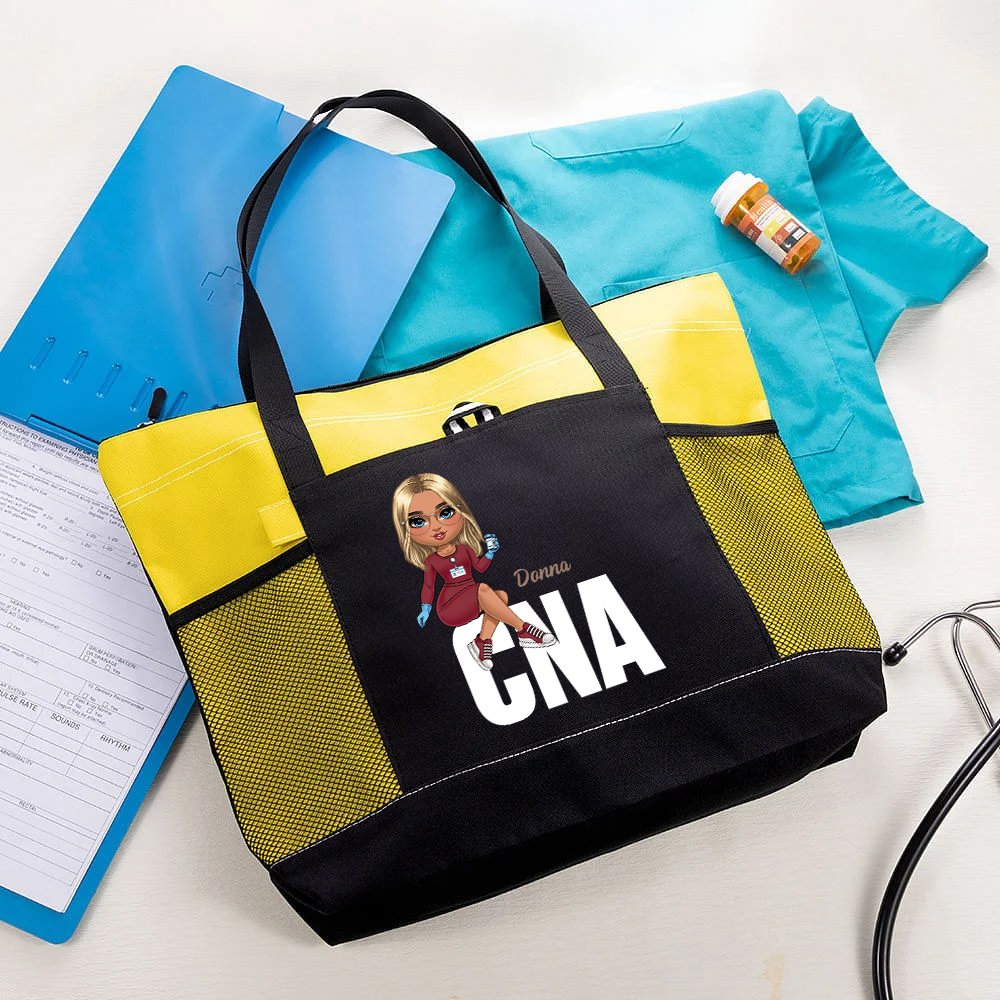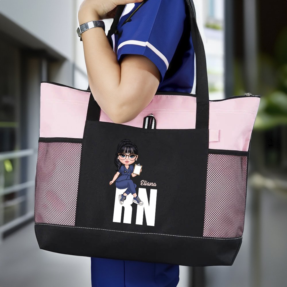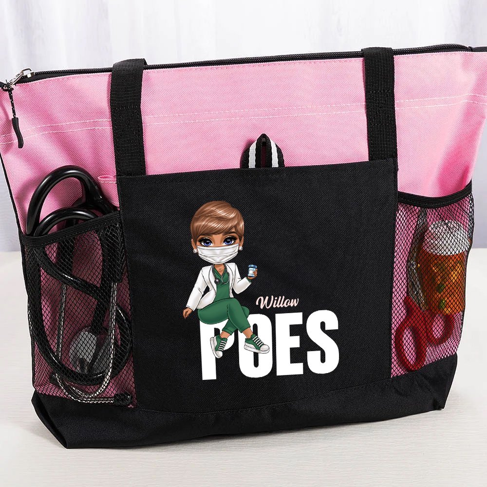 Esta bolsa combina estilo y utilidad, con una figura femenina personalizada de un dibujo animado médico, su nombre y su título profesional. Su llamativo diseño refleja tu estilo inconfundible y tu carácter vibrante, lo que la convierte en un accesorio excepcional.