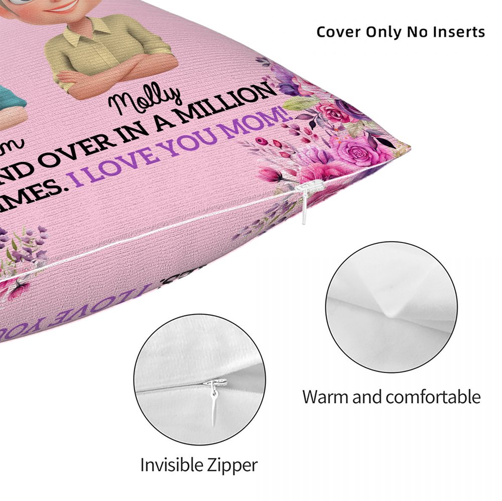 Esta suave funda de almohada destaca por su exclusivo diseño de dibujos animados de madre e hija, que representa vívidamente las cálidas interacciones entre madres e hijas. Es adecuada para niñas y mujeres de todas las edades. El nombre personalizable hace que cada funda de almohada sea única, añadiendo un toque personal a la decoración de su hogar y mostrando perfectamente su estilo. Tiene un diseño de texto fijo: "TE ELEGIRÍA PARA SER MI MADRE UNA Y OTRA VEZ EN UN MILLÓN DE VIDAS. TE QUIERO MAMÁ" para que expreses tu amor en voz alta.