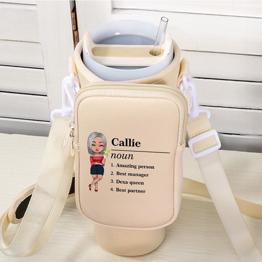 Esta bolsa de transporte de botellas de agua personalizada ofrece opciones de nombre y texto personalizados, lo que te permite crear un diseño de personaje de dibujos animados único, desde el color del pelo hasta el color de la ropa, etc., que refleje tu estilo y añadir tus 1-5 citas favoritas u otros textos. Perfecta para uso personal o como regalo original.