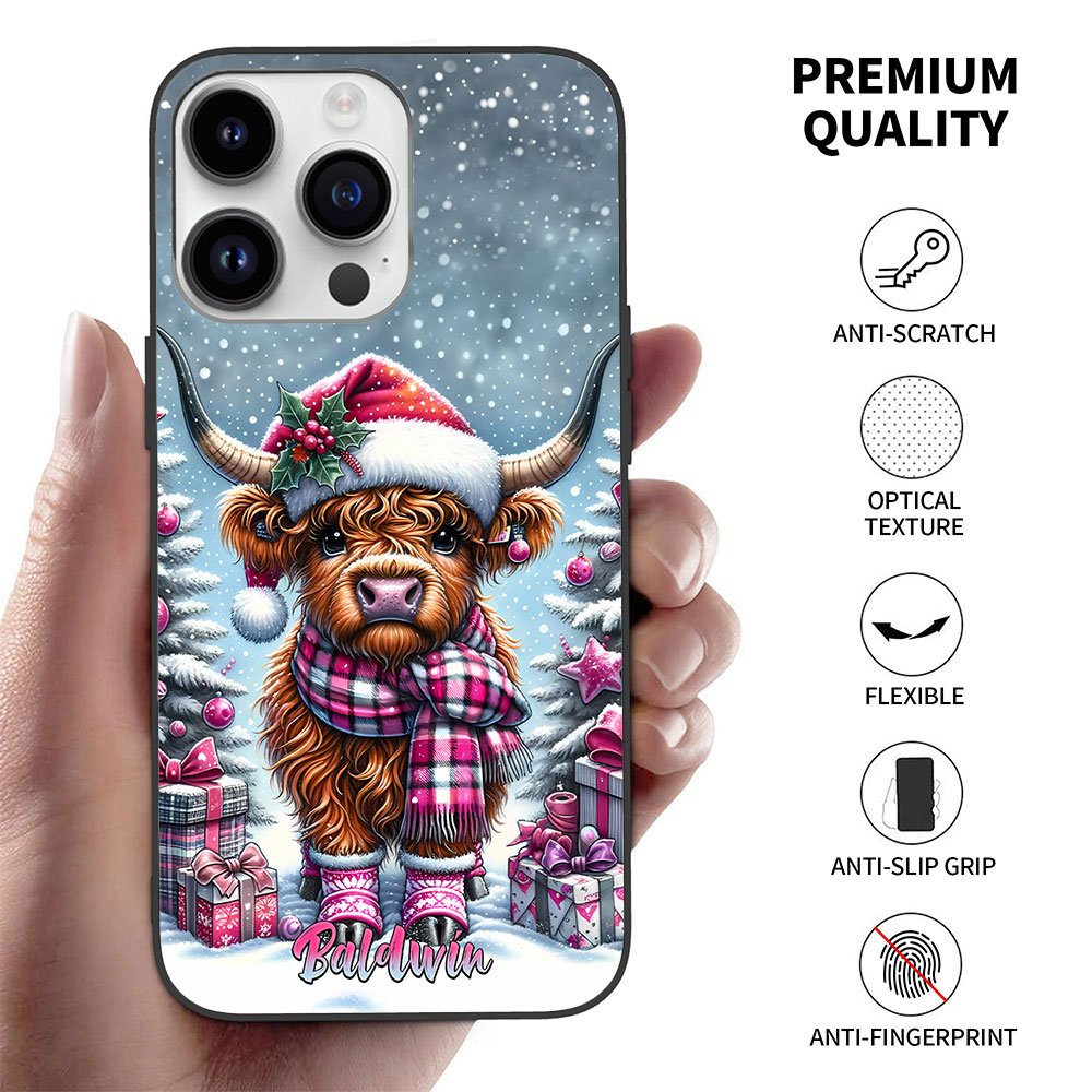 Funda personalizada para iPhone con el nombre de la vaca Highland de Navidad de dibujos animados de nieve Regalo de Navidad para la familia amigo High