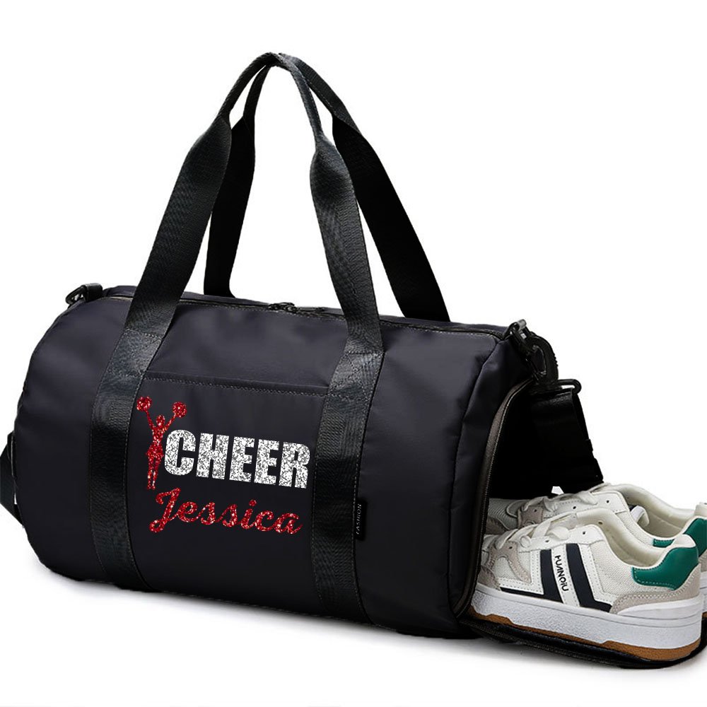 La bolsa de deporte presenta un diseño único que se puede personalizar con poses y nombres de animadoras. El estampado brillante muestra la personalidad de las animadoras, mientras que la palabra "CHEER" añade un toque extra de espíritu de equipo. Con múltiples opciones de poses y una gran variedad de colores de purpurina para elegir, esta bolsa destaca por su estilo.