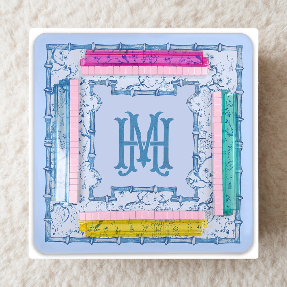Con una clásica combinación de colores azul y blanco, este tapete de mahjong incorpora flores de cerezo, pájaros, pagodas y motivos de bambú lavados con tinta. Las puntadas azul claro de los bordes se hacen eco del diseño general, mostrando el estilo chino y la belleza artística oriental. Las letras personalizadas añaden un toque único, haciendo que el tapete destaque entre la multitud y refleje un estilo personal.