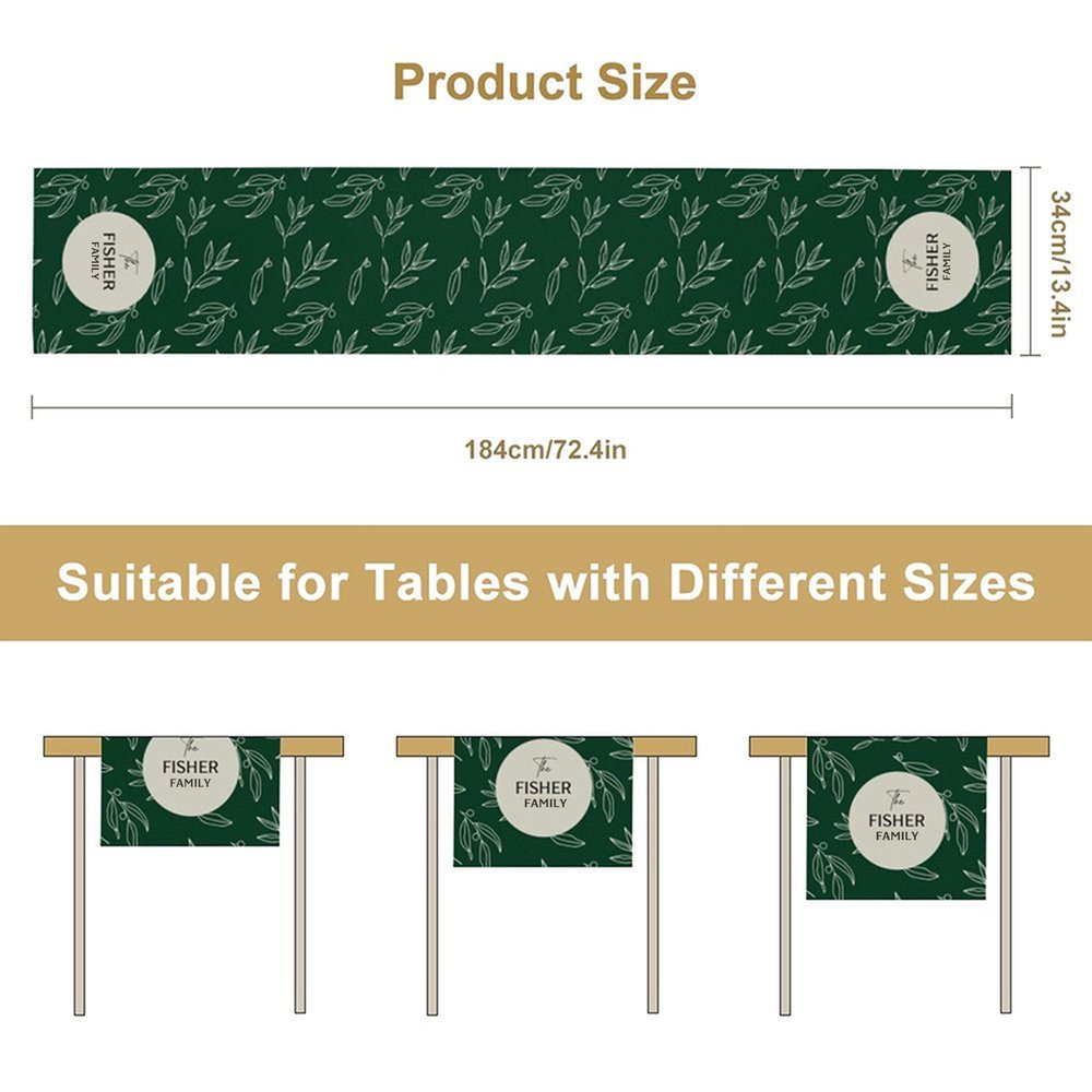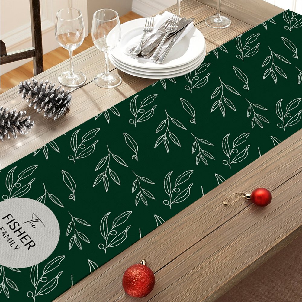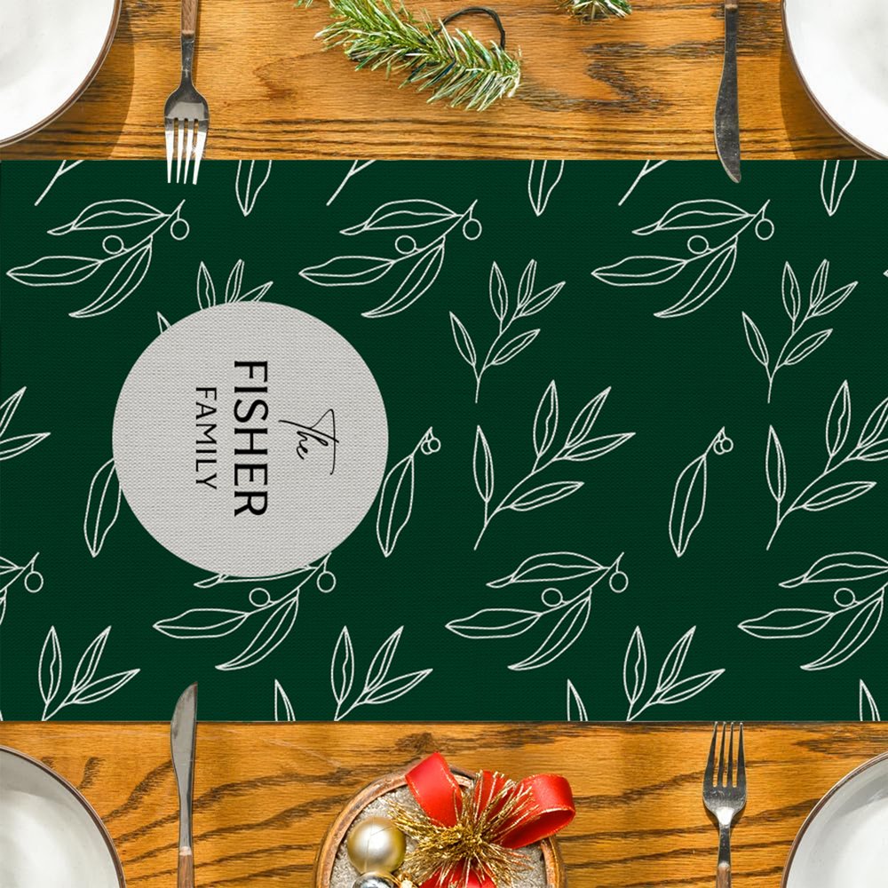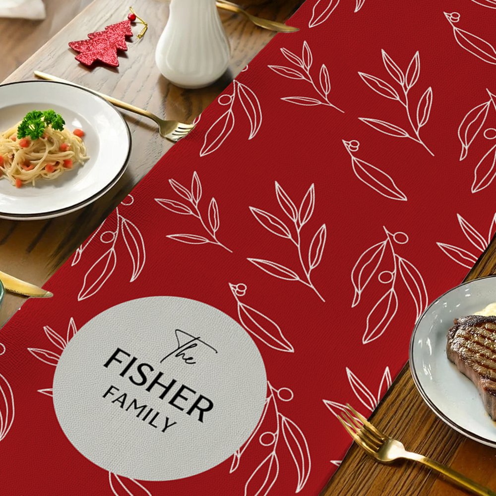 Este camino de mesa presenta hermosas hojas navideñas para darle un toque estacional, y con la posibilidad de elegir entre rojo o verde, encarna el espíritu navideño. Personalizable con el nombre de tu familia, simboliza la calidez y la unión, haciendo que cada comida navideña sea especial.
