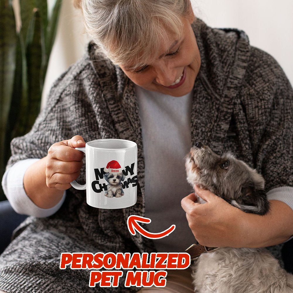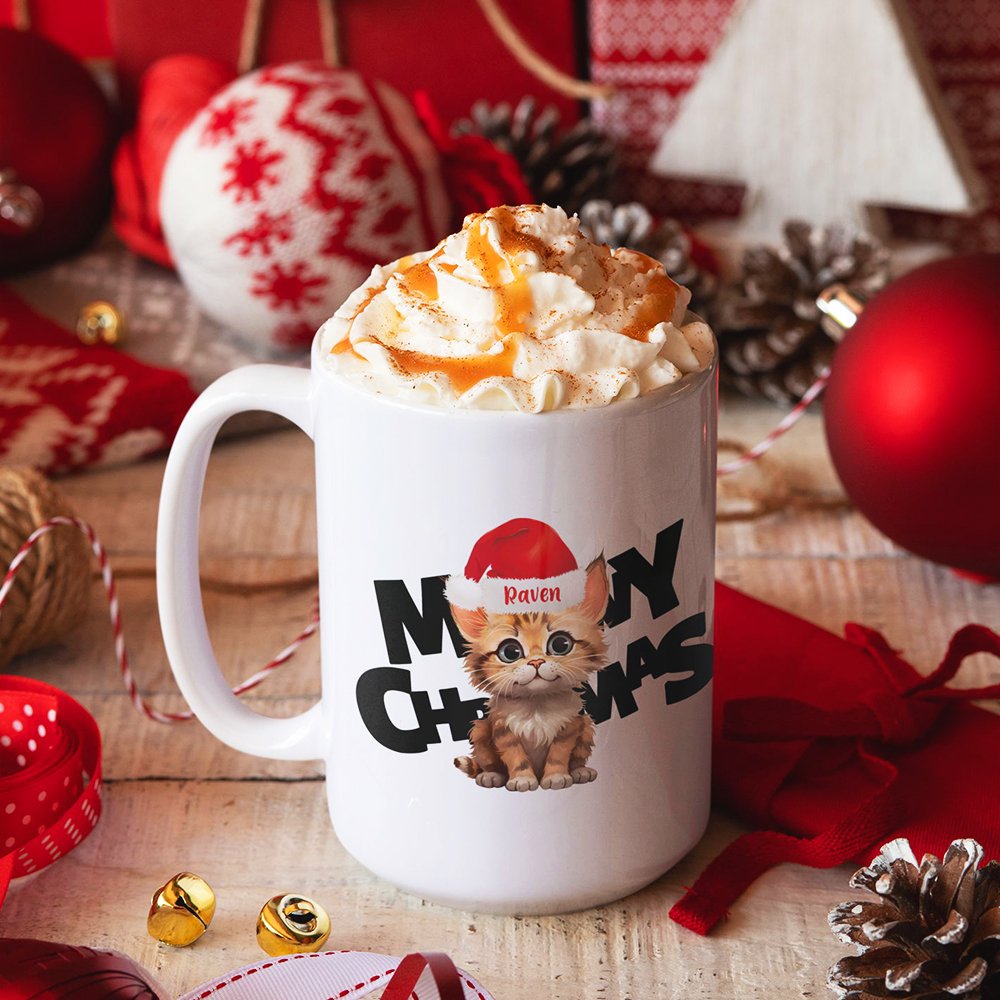 El exterior de la taza presenta un encantador y divertido mensaje "Meowy Christmas", acompañado de un adorable gráfico de un gato o un perro con un festivo gorro de Papá Noel. Con la posibilidad de personalizar el nombre y la raza de la mascota en la taza, se trata de un delicioso regalo navideño que satisface el amor por las mascotas.