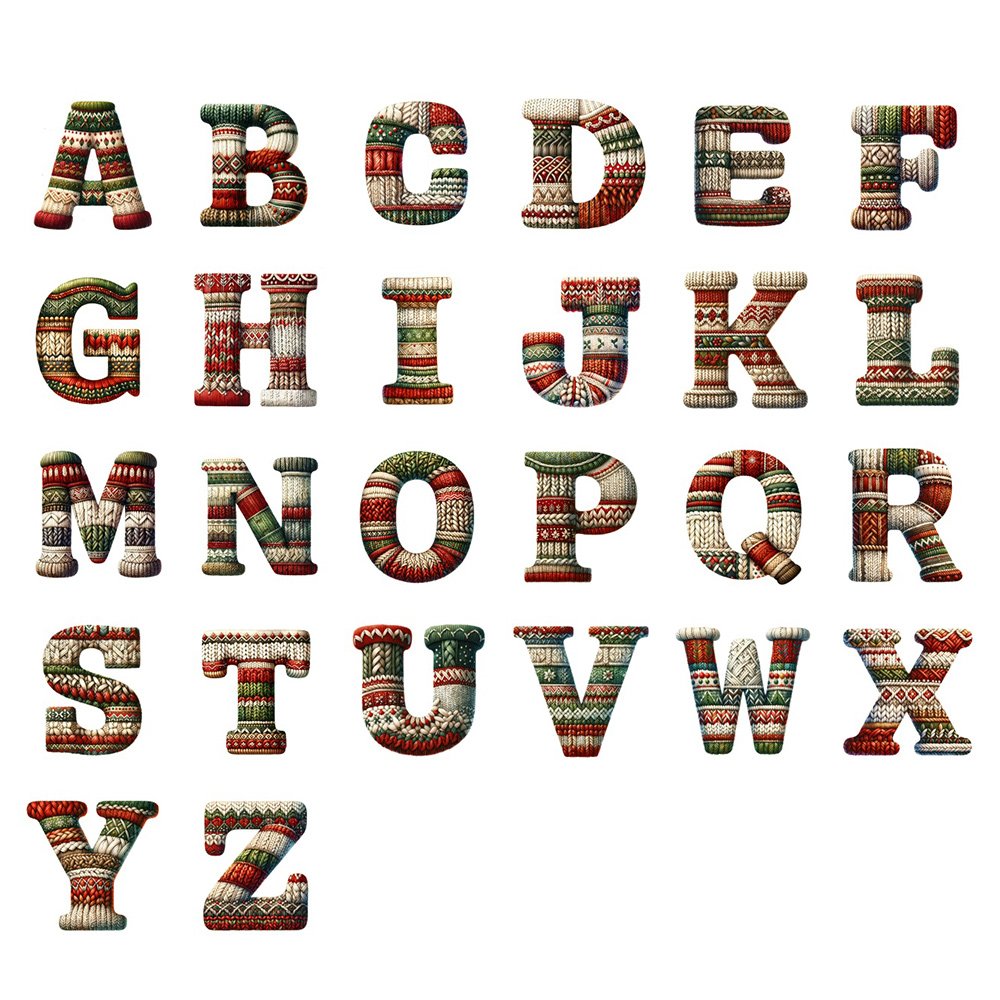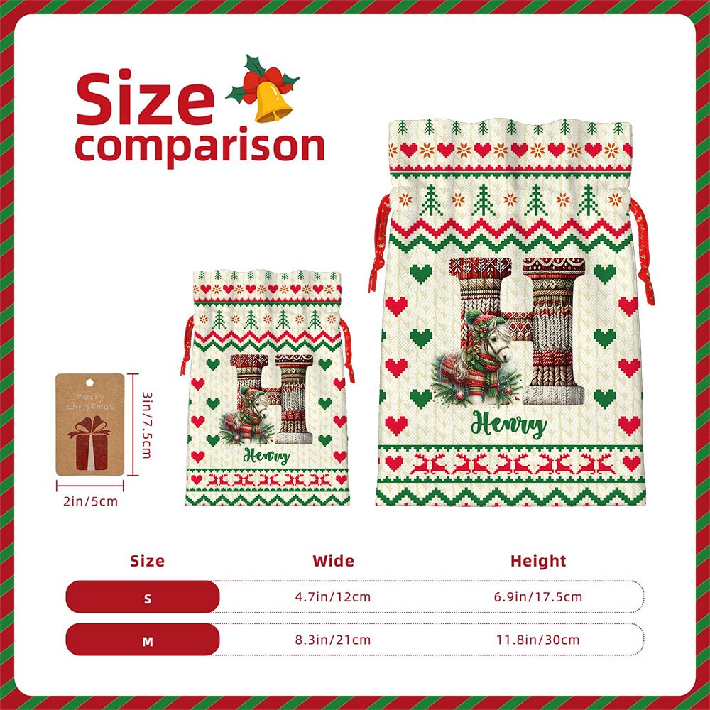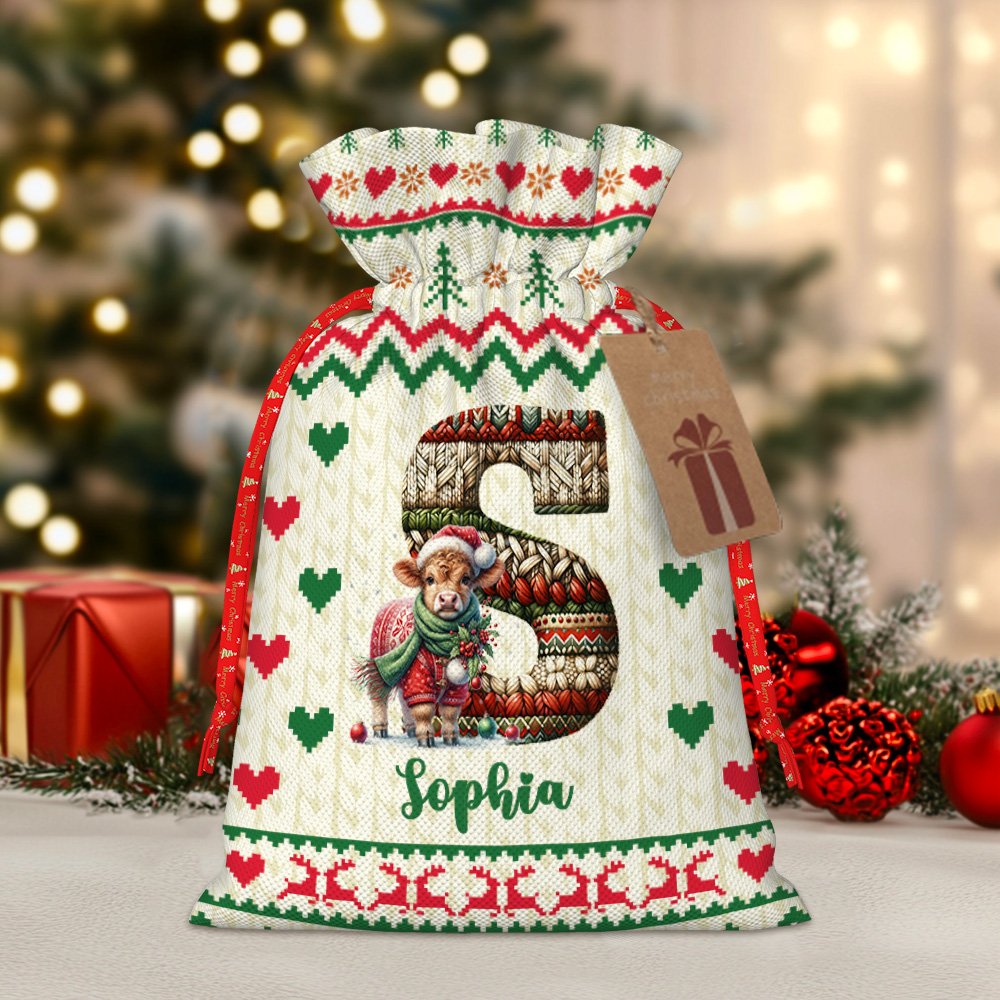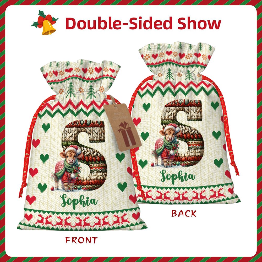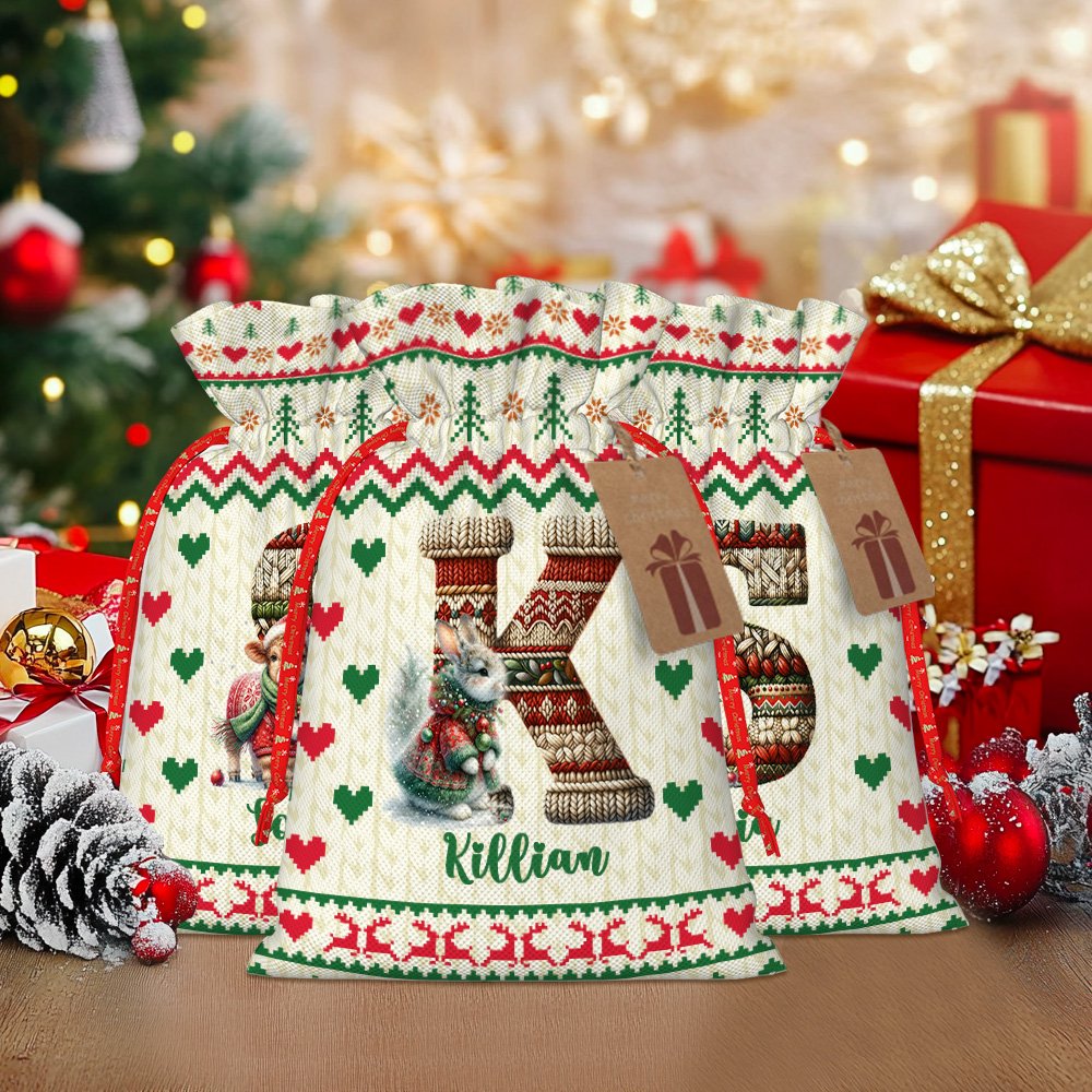 Cada bolsa presenta iniciales y nombres personalizados en un diseño de punto que le da un toque acogedor y artesanal. El elemento de textura de punto crea una estética navideña cálida y tradicional. La personalización hace que cada bolsa de regalo sea especial para su destinatario.