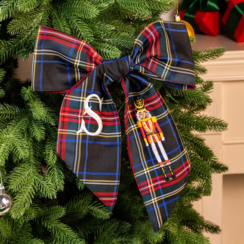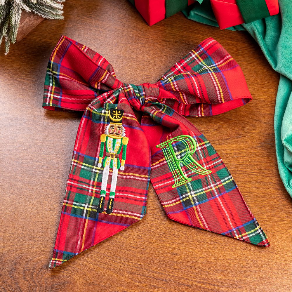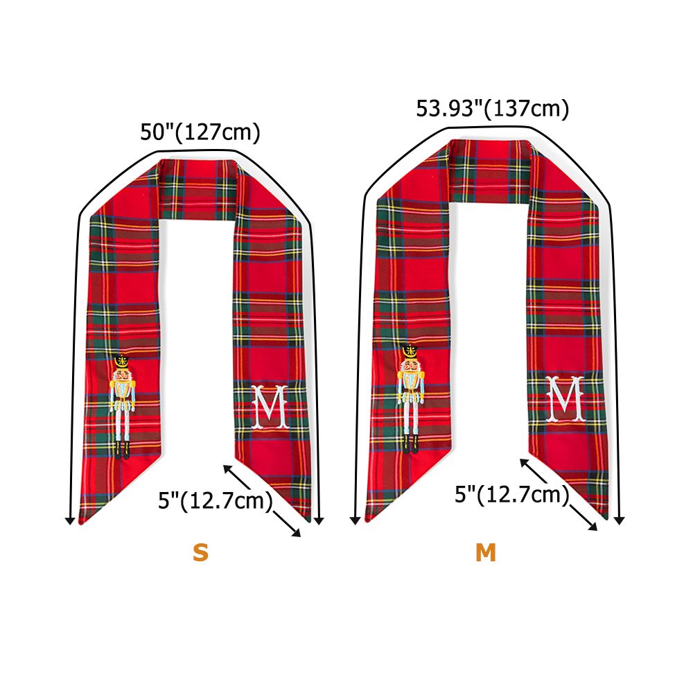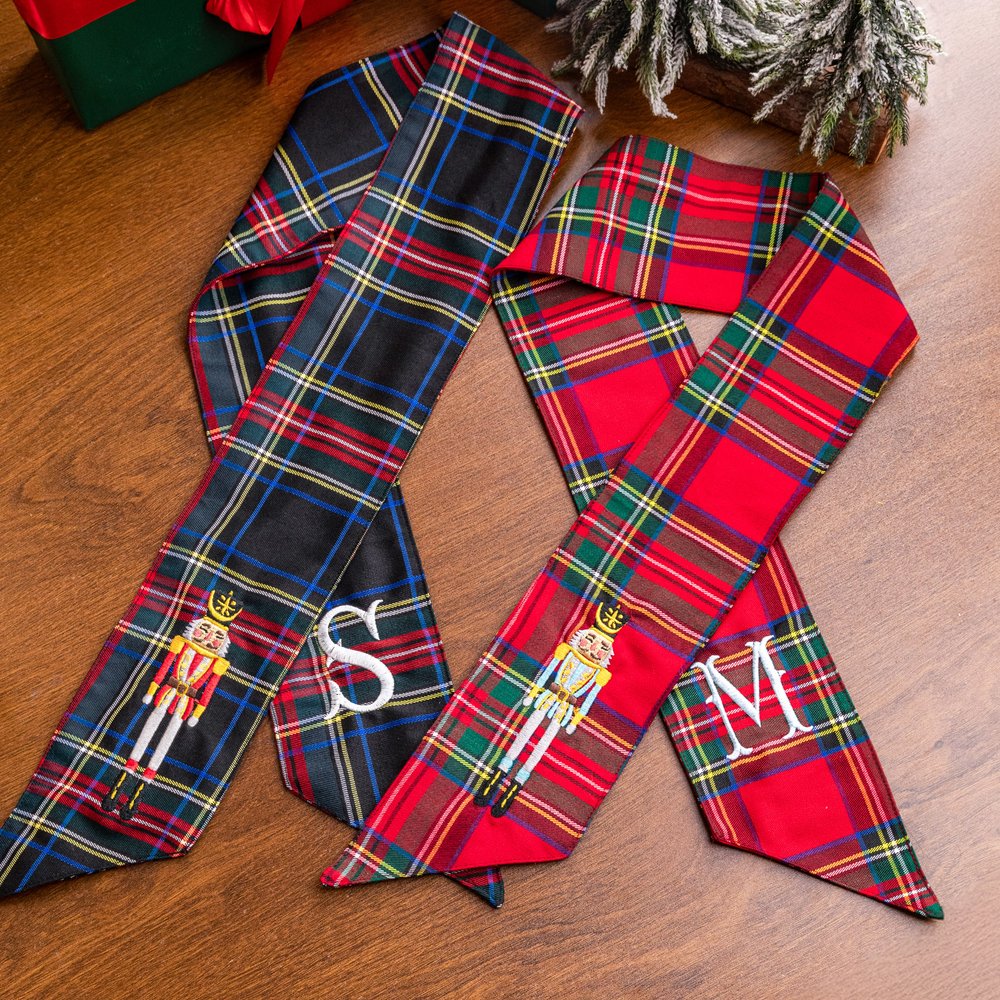 Confeccionado en tela escocesa de primera calidad en rojo clásico y verde azulado elegante, este fajín decorativo presenta exquisitos diseños de cascanueces bordados en tres variaciones de color distintas. La pieza se puede personalizar aún más con letras personalizadas, creando un accesorio de vacaciones impresionante que trae el mundo mágico de El Cascanueces a su decoración navideña.