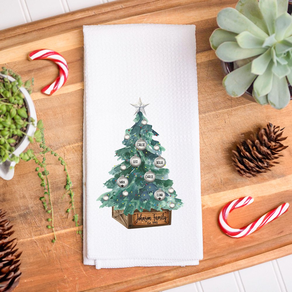 Personaliza este paño de cocina con los nombres de entre 2 y 8 miembros de la familia en adornos que cuelgan del árbol de Navidad. Añade el apellido de tu familia o un mensaje sincero (por ejemplo, "The Smith Family Est. 1995") a la caja de madera para darle un toque atemporal y sentimental.