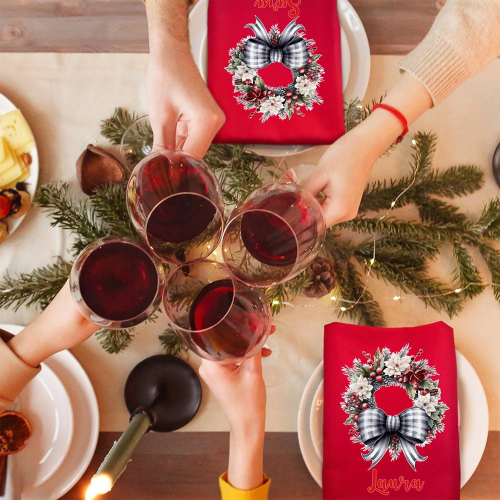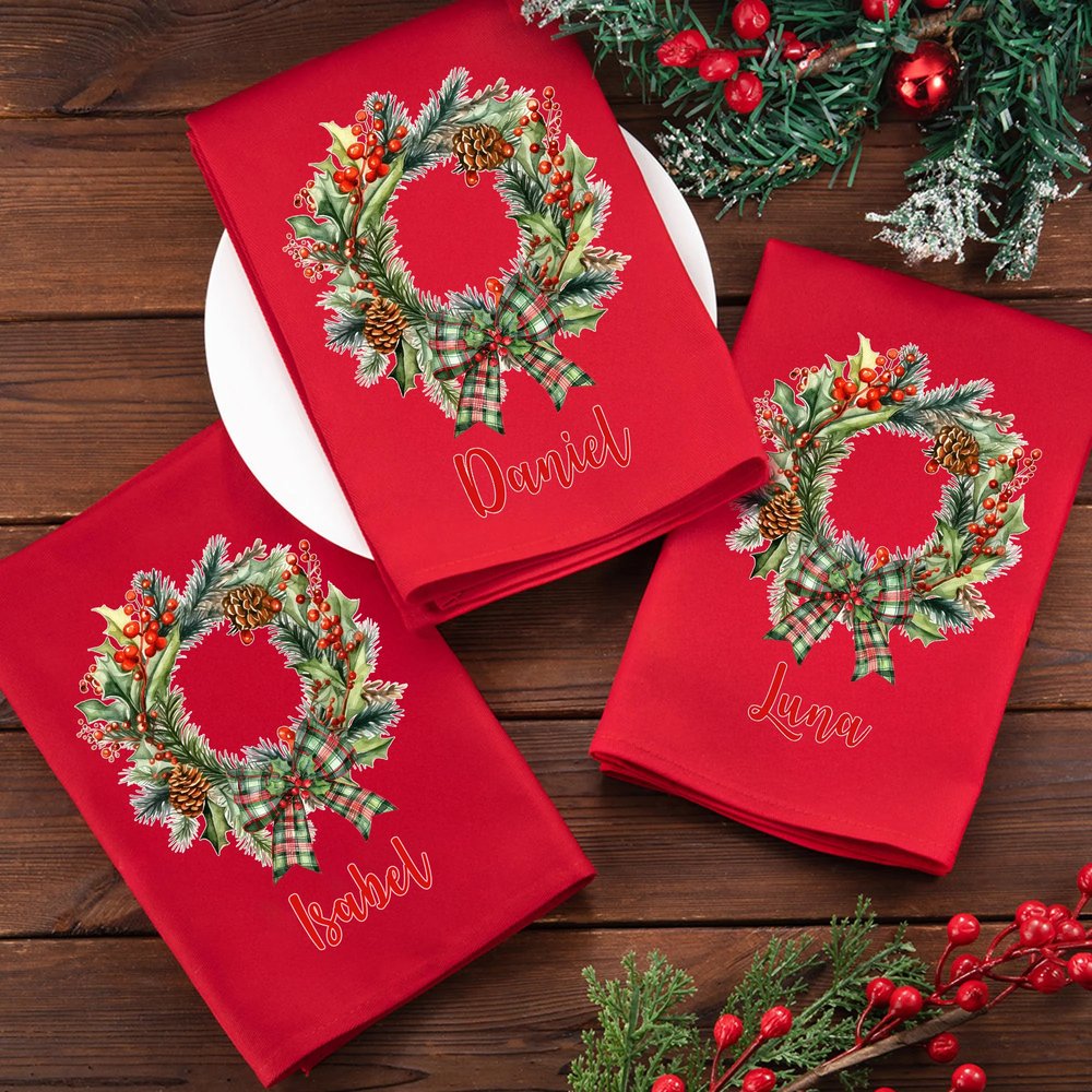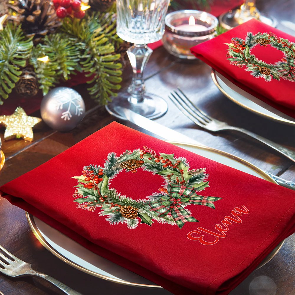 Esta servilleta se inspira en la clásica corona navideña, mezclando ingeniosamente elementos como vibrantes bayas rojas, piñas, flores festivas y un lazo a cuadros para crear un rico ambiente festivo. El nombre personalizado convierte cada pieza en un emblema distintivo de la temporada. Al combinar a la perfección la alegría festiva con una personalización bien pensada, añade un toque único y memorable a cualquier mesa navideña.