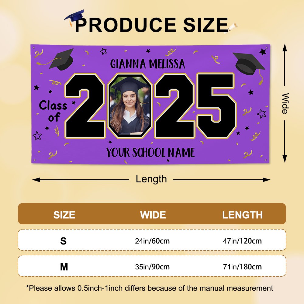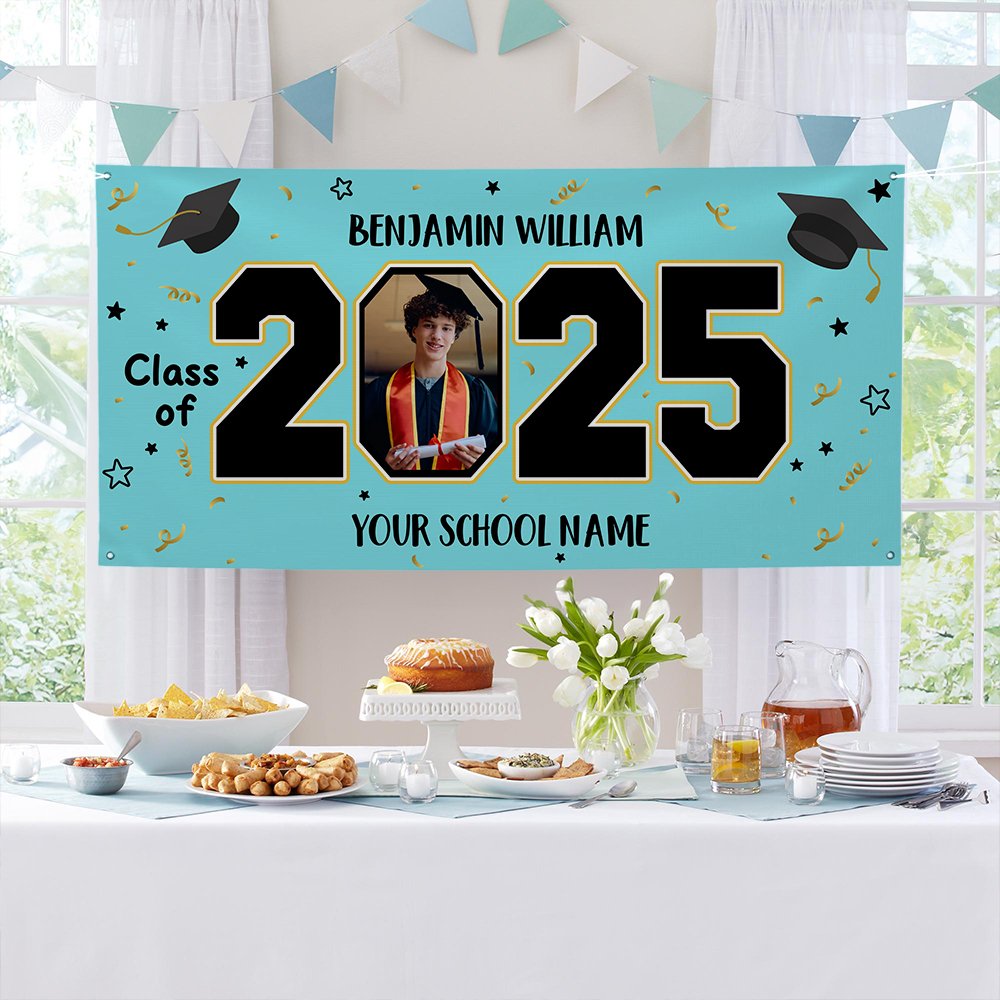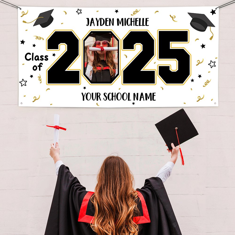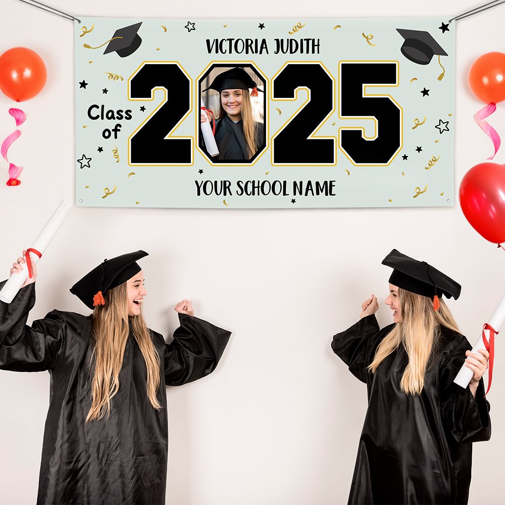 Esta vibrante pancarta presenta un elegante diseño con un "2025" gigante en el centro y su foto, rodeado de elementos de birretes de graduación y cintas doradas. Personalizarla con la foto y el nombre del graduado, así como con el nombre del centro educativo, añade un toque especial, convirtiéndola en una decoración destacada para conmemorar sus logros.