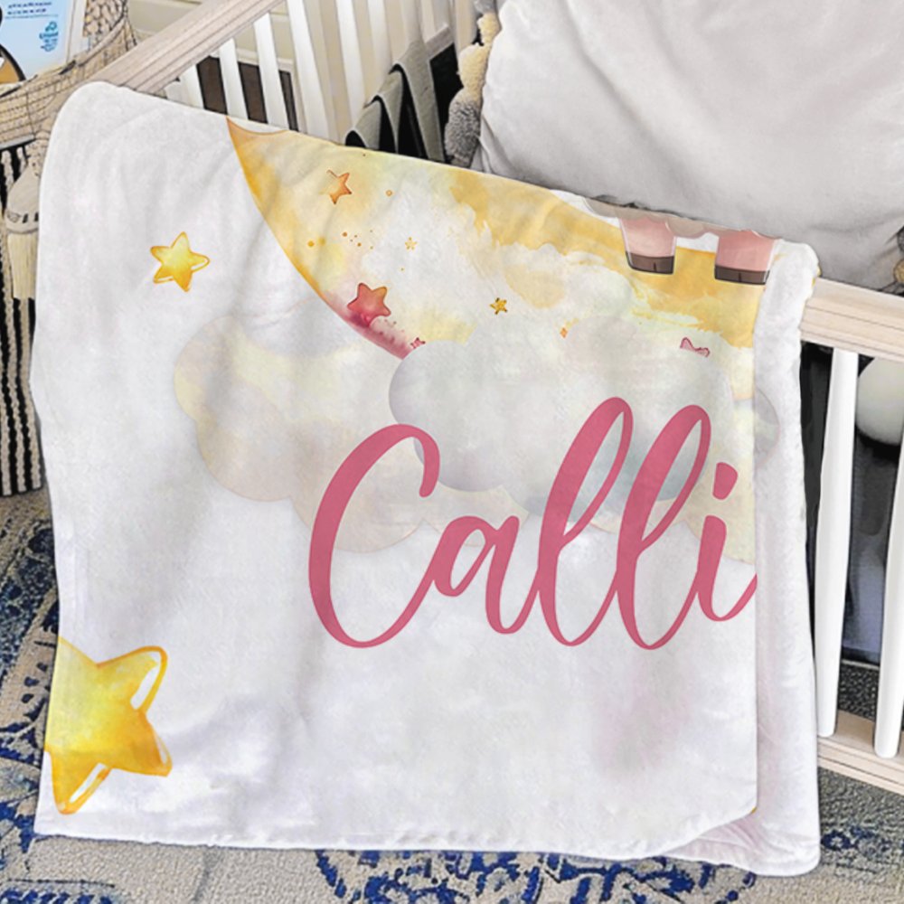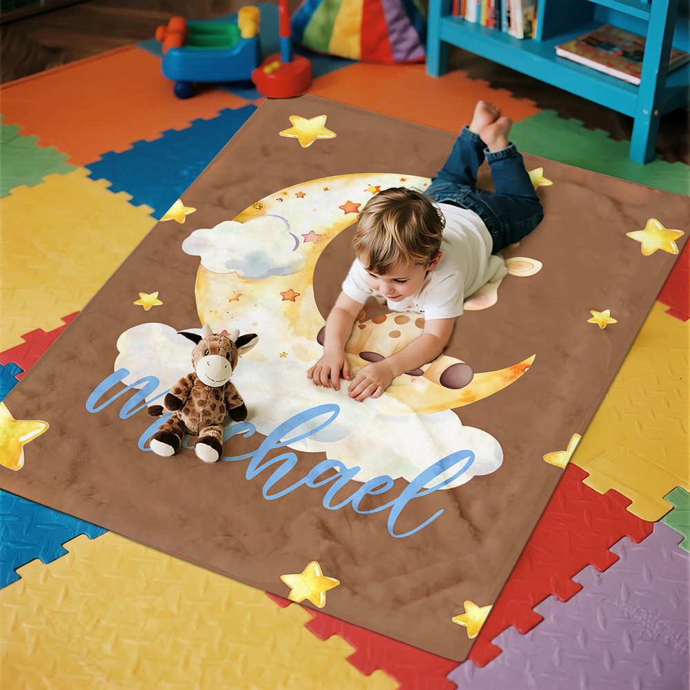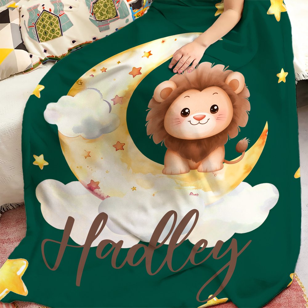 Esta manta se inspira en los animales del bosque y del océano, mezclando ingeniosamente adorables leones, jirafas, pingüinos y otros animales con elementos naturales como la luna y las nubes para crear una escena de cuento. Los colores vibrantes y armoniosos captarán al instante la atención de los niños. Hay nombres personalizables, lo que convierte a cada manta en un recuerdo único.