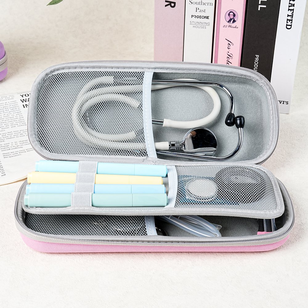 Este estuche para estetoscopio presenta símbolos médicos icónicos y una estructura de carcasa dura y duradera, complementada con una identificación personalizable para evitar confusiones y resaltar al mismo tiempo la identidad profesional. El bolsillo de malla integrado ofrece un práctico espacio para guardar pequeños utensilios, como una linterna o unas tijeras para vendajes.