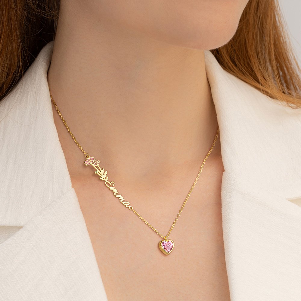 Este collar presenta un diseño sencillo pero elegante con una piedra de nacimiento en forma de corazón engastada en la base. Personalízalo con tu nombre y la colorida flor de nacimiento, creando un regalo único que celebra la individualidad y el sentimiento.