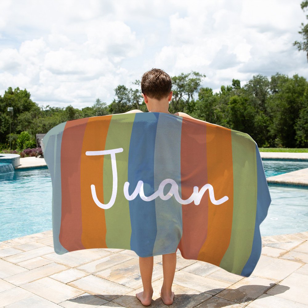 Esta toalla de playa de rayas clásicas y coloridas hará que tu día en la playa sea único. El diseño personalizable con tu nombre te permite destacarte entre la multitud y disfrutar del entusiasmo del verano. ¡Envuelve tu cuerpo con estilo lujoso y crea tu propio look veraniego!