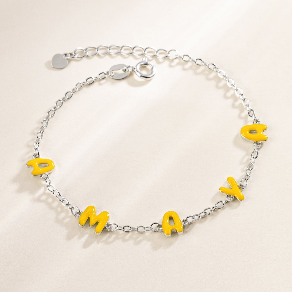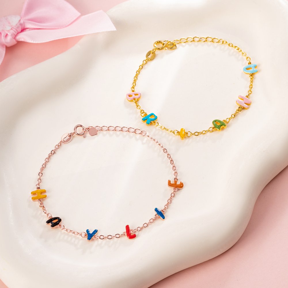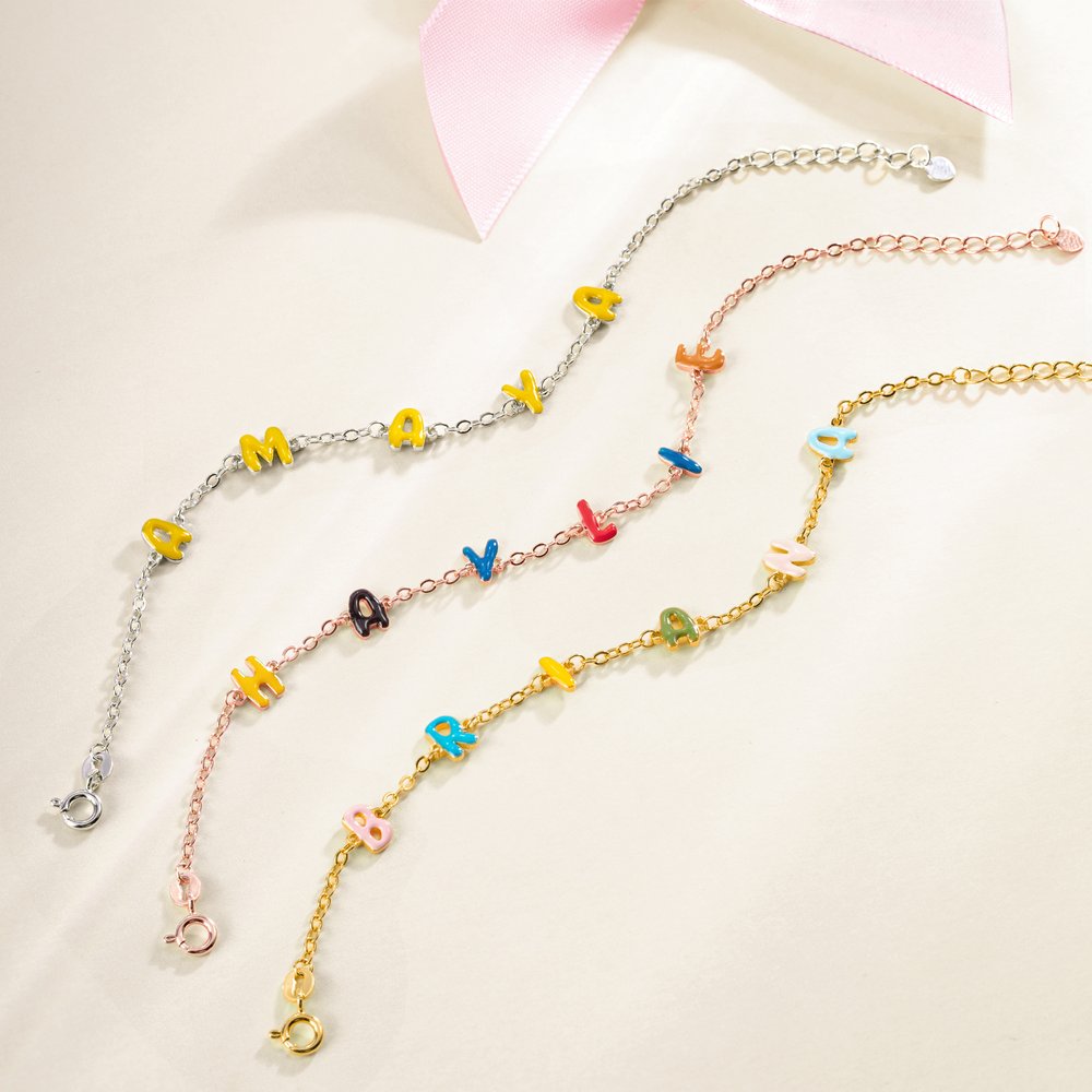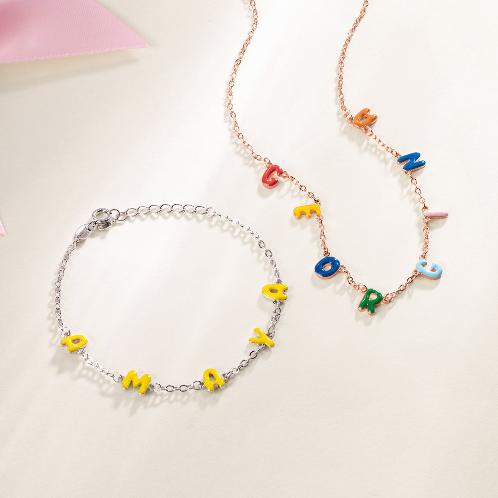 Esta pulsera y este collar presentan un diseño único con coloridas letras de burbujas personalizables como elemento principal, que añaden un toque lúdico a la joyería tradicional. Cada letra se asemeja a una encantadora burbujita, redonda y simpática, que rompe con la rigidez de los estilos convencionales. Puedes elegir diferentes combinaciones de letras en función de tu nombre, haciendo que esta pieza sea realmente única y refleje tu personalidad y actitud.