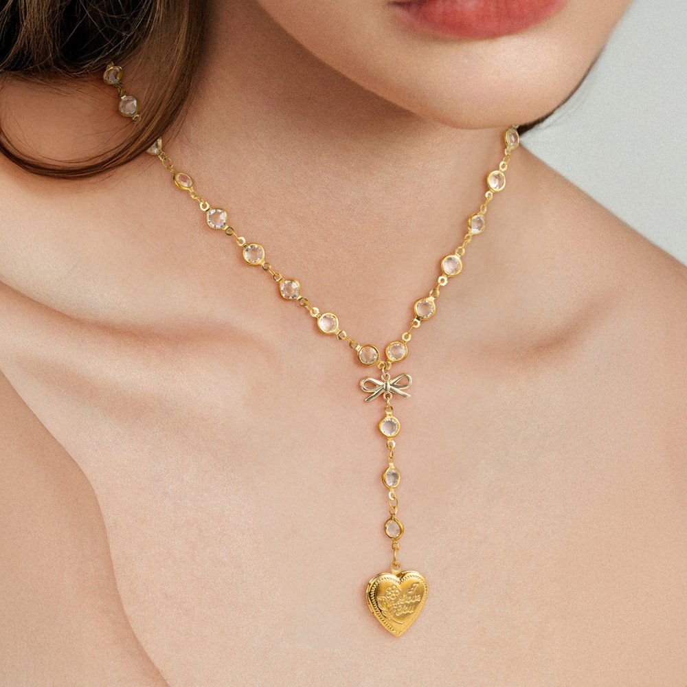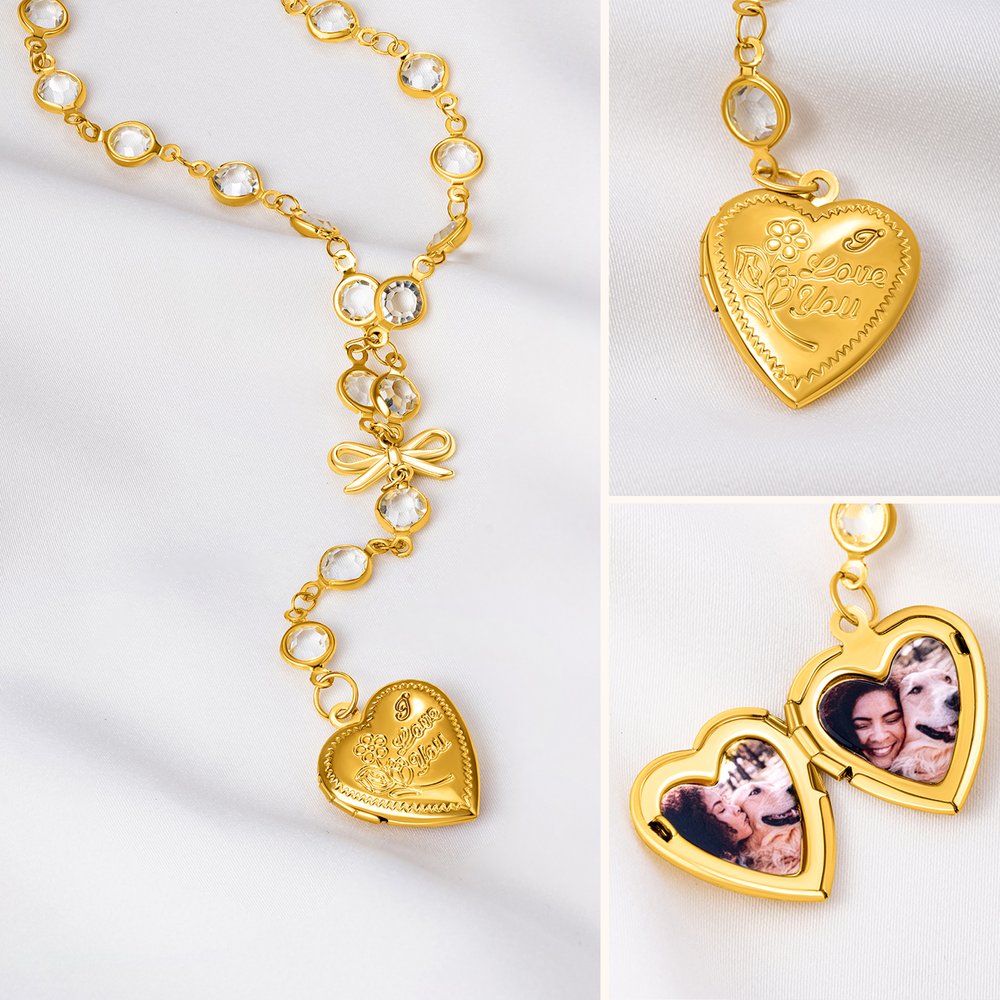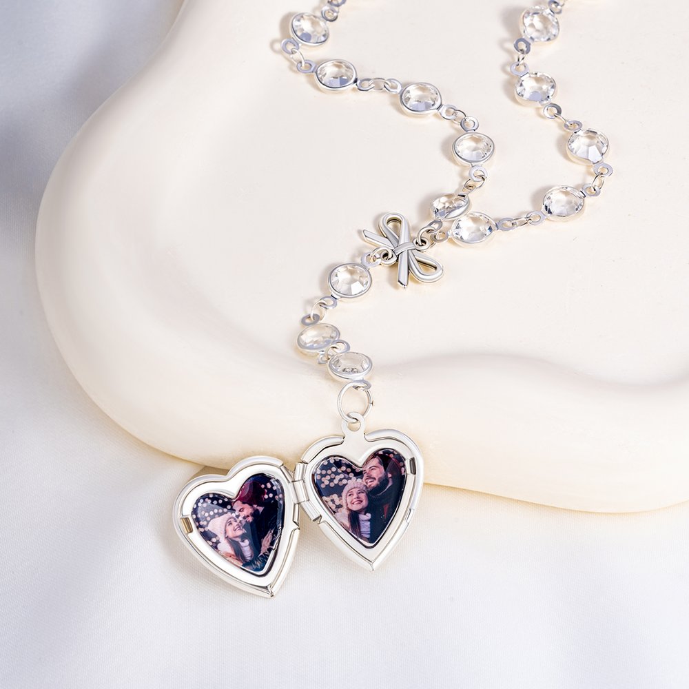 Este collar cuenta con elegantes colgantes en forma de lazo y corazón, y el colgante en forma de corazón también ofrece un servicio de fotos personalizadas. Puedes convertir cualquier momento preciado en un colgante, convirtiéndolo en un accesorio único.