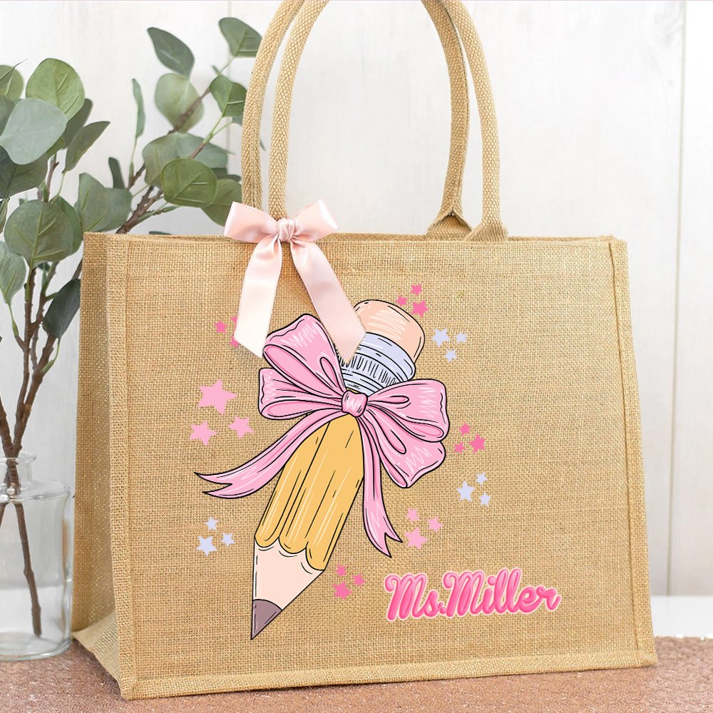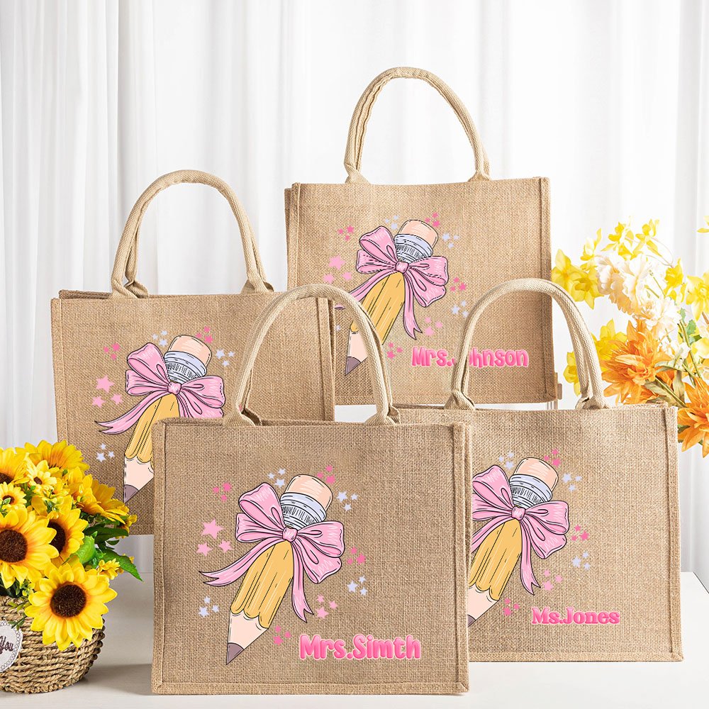 Nuestra bolsa de yute cuenta con un lápiz arco coqueta llamativo, que captura la esencia del mundo de un maestro, un nombre especial se puede personalizar para mostrar su respeto y aprecio por ellos.