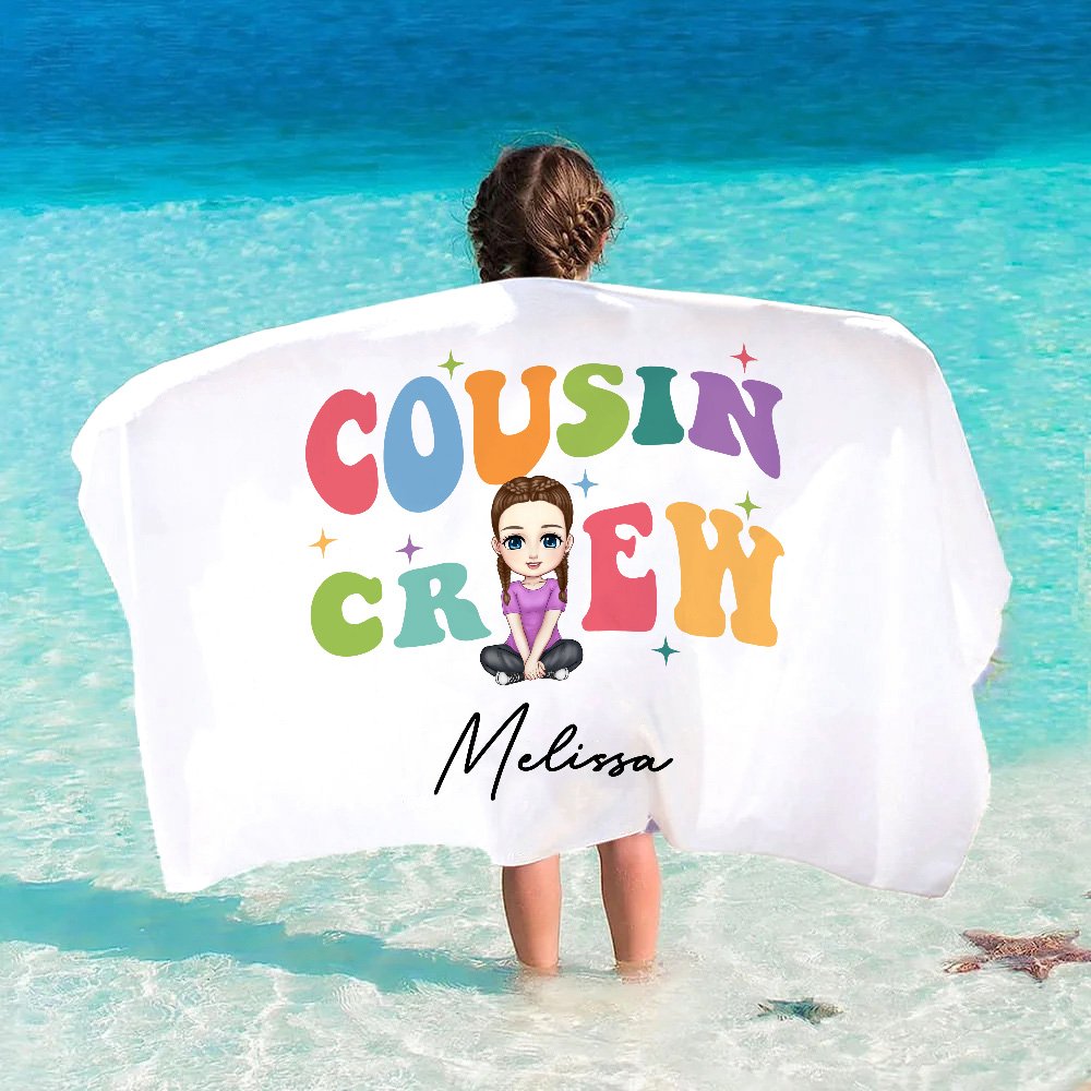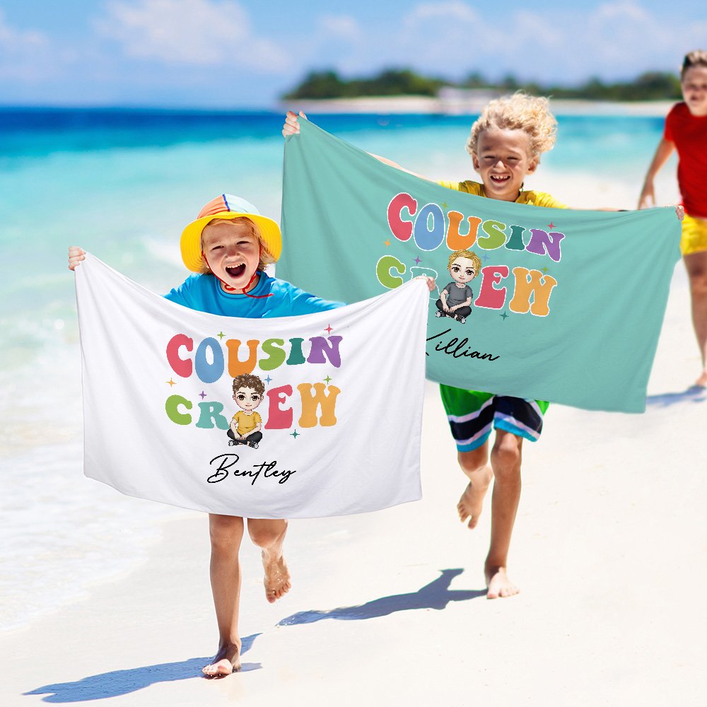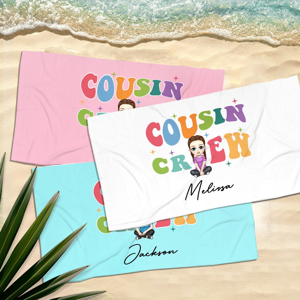 Esta toalla de playa lleva las palabras "Cousin Crew" y está acompañada de coloridos y vivos personajes de dibujos animados. Cada personaje de dibujos animados es vivo y adorable, lleno de un ambiente alegre. También puede personalizar el nombre de la toalla de playa para hacerla más exclusiva.